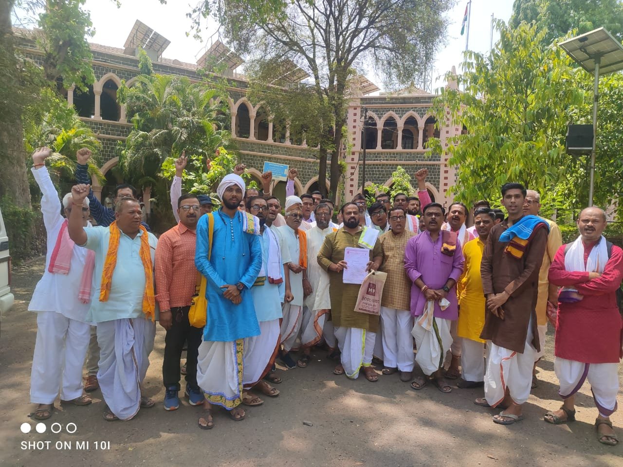 सविस्तर वृत्त असे की, जळगाव जिल्हा पुरोहित मंडळातर्फे आज सकाळी जिल्हाधिकारी कार्यालयावर मोर्चा काढण्यात आला. त्यानंतन जिल्हाधिकाऱ्यांना निवेदन देण्यात आले. निवेदनात म्हटले आहे की, राष्ट्रवादी पार्टीचे आ.अमोल मिटकरी यांनी दि.19 एप्रिल रोजी कार्यक्रमात बोलतांना हिंदू धर्माच्या विवाह पध्दती बदल चुकीचे मंत्र म्हणून पुरोहित वर्गाची टिंगल टवाळकी केल्याने अकलेचे तारे तोडले व त्या अज्ञानी माणसाच्या अशा वक्तव्यावर राज्याचे सामाजिक मंत्री मुंडे व जयंत पाटील यांनी खळखळून दाद दिल्याबद्दल या नेत्यांवर कारवाई व्हावी म्हणून जिल्ह्यातील पुरोहित मंडळोन आज जिल्हाधिकाऱ्यांना निवेदन दिले. याप्रसंगी अध्यक्ष भुषण मुळे, सचिव अजय जोशी, पुरुषौत्तम शुक्ल, विजय जोशी, अविकुमार जोशी, दिपक भट, योगेश्वर जोशी, विवेक जोशी, देवेंद्र काळे यांच्यासह समाजबांधव मोठ्या संख्येने उपस्थित होते.