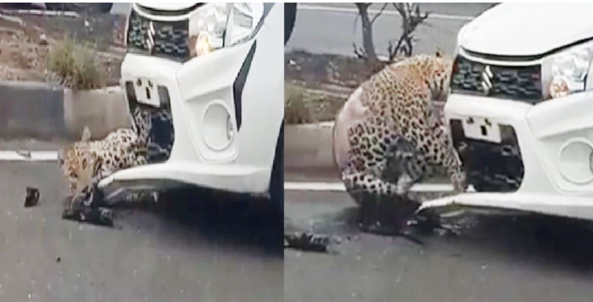 कार आणि बिबट्याची धडक झाली. या धडकेत बिबट्याचे पाय बोनेटमध्ये अडकले. बिबट्या आपला जीव वाचवण्यासाठी धडपड करू लागला. ही संपूर्ण घटना तिथल्या नागरिकांनी कॅमेऱ्यात कैद केली. बिबट्याचा अंगावर काटा आणणारा व्हिडीओ व्हायरल होत आहे. हा व्हिडीओ नाशिक-पुणे मार्गावरचा असल्याचं सांगितलं जात आहे. सध्या हा व्हिडीओ सोशल मीडियावर व्हायरल होत आहे. बिबट्याची ही अवस्था पाहून तुम्हालाही दया येईल.