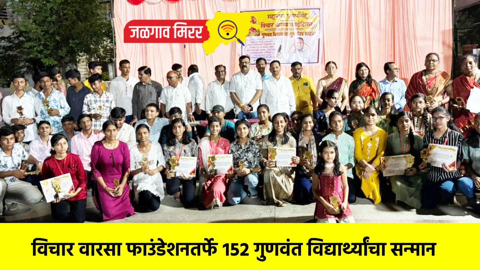 येथील मेहरूण परिसरातील विचार वारसा फाउंडेशनतर्फे गुणवंत विद्यार्थ्यांचा गुणगौरव सोहळा रविवारी दि. १ जून रोजी संध्याकाळी आयोजित करण्यात आला होता. यात मान्यवरांनी १५२ गुणवंत विद्यार्थ्यांचा प्रमाणपत्र, सन्मान चिन्ह, मेडल देऊन गौरव करण्यात आला. यावेळी, विद्यार्थ्यांनी आयुष्यात पुढे जाताना भविष्यामध्ये सामाजिक बांधिलकी जोपासावी अशी अपेक्षा मान्यवरांकडून व्यक्त करण्यात आली.