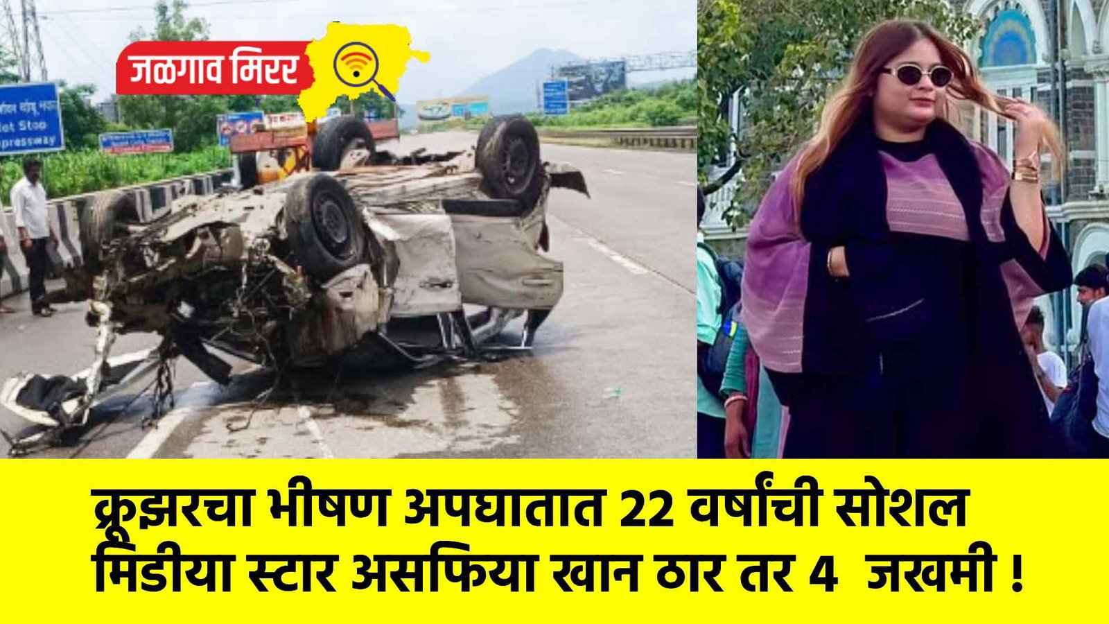 सविस्तर वृत्त असे कि, उत्तर प्रदेशमधील लखनौ येथील असफिया खान ही रहिवाशी आहे. ती मित्रांसोबत फिरण्यासाठी मुंबईला आली होती. त्यांची गाडी लोणावळ्याला निघाली होती, त्यावेळी पलस्पे फाट्याजवळ गाडी काँक्रीट ब्लॉकला धडकून पलटी झाली. या अपघातातील जखमींना कपूर रुग्णालयात उपचारासाठी दाखल करण्यात आले आहे. या अपघातात अवघ्या २२ वर्षांच्या असफिया हिला आपला जीव गमावावा लागला आहे. ती सोशल मीडिया इन्फ्लूएन्सर होती. तिचे सोशल मीडियावर दहा लाखांहून अधिक फॉलोअर्स होते. ती मूळची उत्तरप्रदेशची रहिवासी होती. १५ दिवसांपूर्वी ती आपल्या मित्रांसह टोयोटा क्रूझर गाडीतून मुंबईत आली होती.