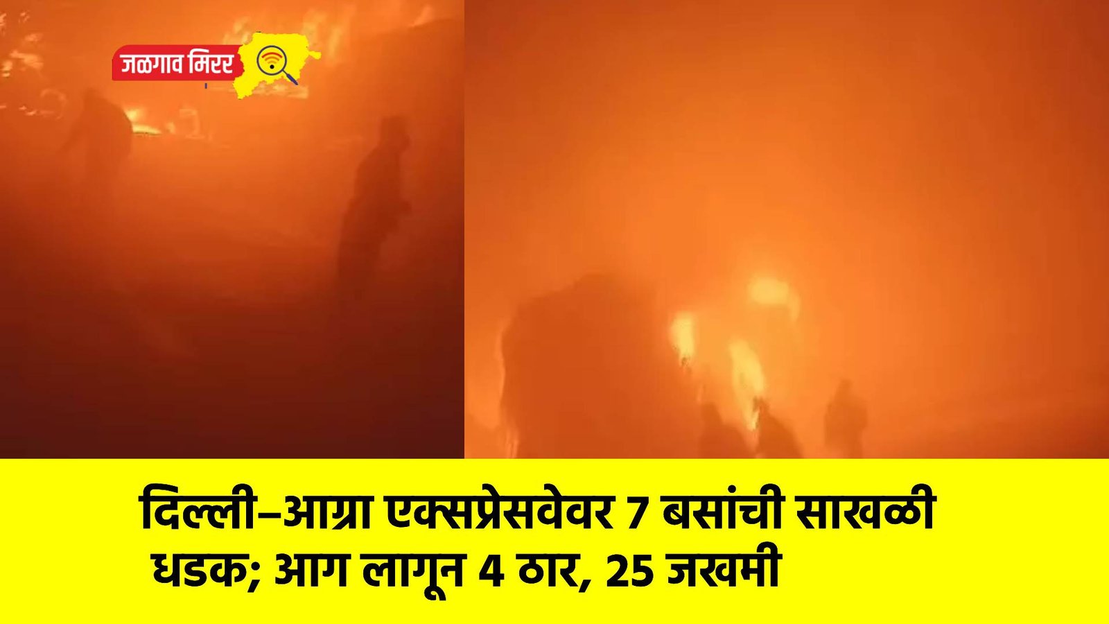 उत्तर प्रदेशातील मथुरा येथे दिल्ली–आग्रा (यमुना) एक्सप्रेसवेवर मंगळवारी पहाटे सुमारे ४ वाजता दाट धुक्यामुळे भीषण अपघात झाला. बलदेव पोलीस ठाण्याच्या हद्दीत सात बस एकामागोमाग आदळल्या. धडकेनंतर काही बसना आग लागल्याने परिसरात घबराट पसरली. या दुर्घटनेत चार जणांचा मृत्यू झाला असून २५ जण जखमी झाले आहेत.