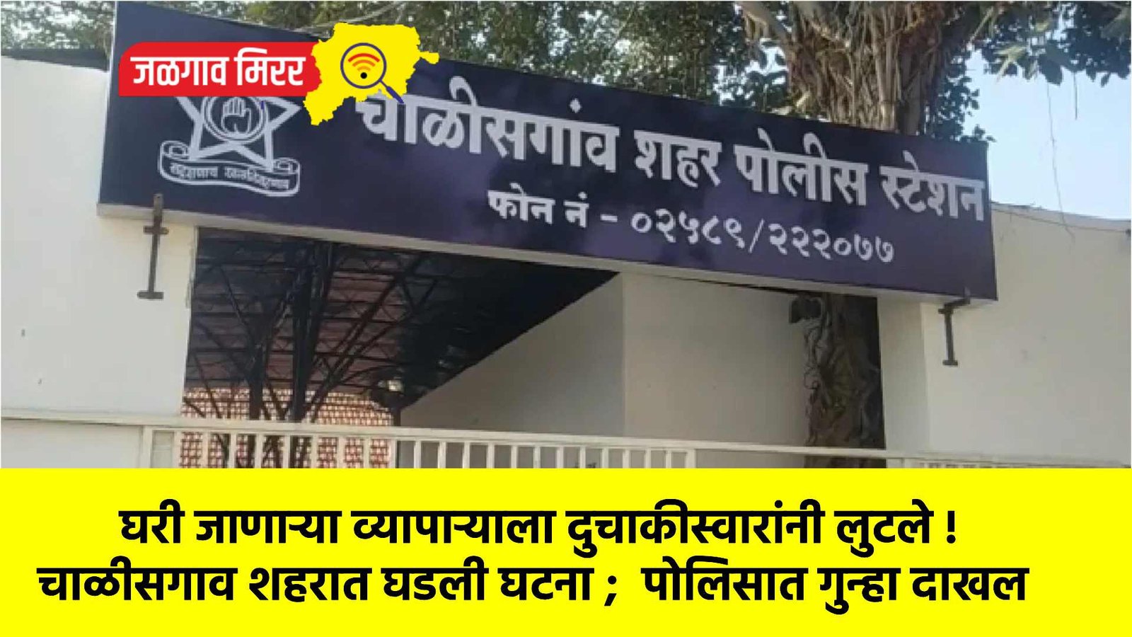 चाळीसगाव शहरात दुकान बंद करून मोटारसायकलवर घरी जात असलेल्या व्यापाऱ्याचे मोटारसायकलच्या पेट्रोल टाकीवर बॅगेत ठेवलेले २० हजार रुपये किंमतीचा आय फोन ११ व १० हजार रुपये किमतीचा वन प्लस मोबाईल फोन तसेच २ लाख ४१ हजार रुपये रोख असा एकूण २ लाख ७१ हजार रुपयांचा मुद्देमाल युनिकॉन मोटारसायकलवर आलेल्या दोघांनी हिसाकावून पोबारा केल्याची घटना शहरातील गवळी वाडा, राठोड हॉस्पीटल रोडवर दि. ३१ मे रोजी रात्री ९ वाजेच्या सुमारास घडली असून चाळीसगाव शहर पोलीस स्टेशनला दोघा चोरट्याविरूध्द गुन्हा दाखल करण्यात आला आहे.