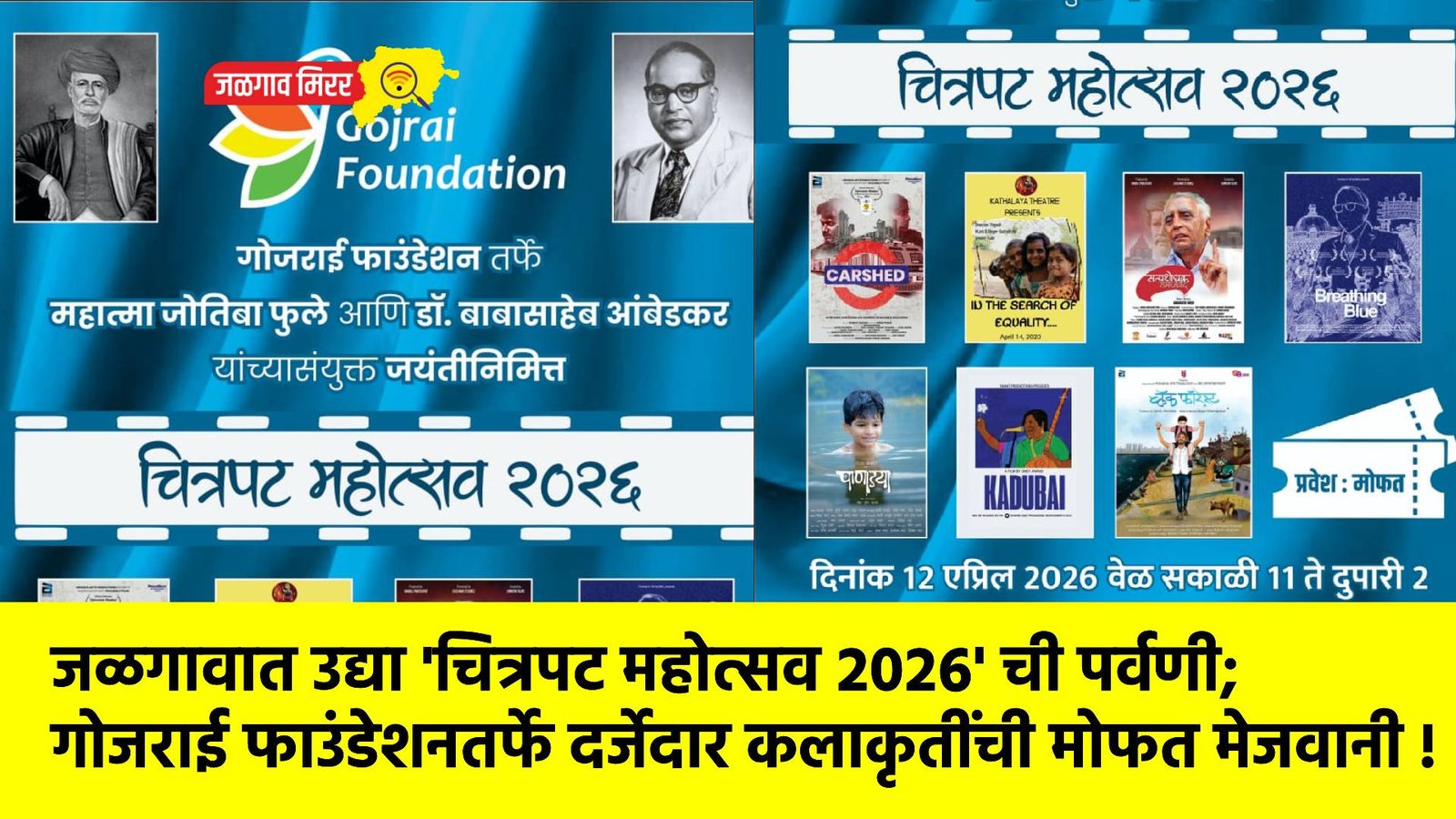 थोर समाजसुधारक महात्मा जोतिबा फुले आणि महामानव डॉ. बाबासाहेब आंबेडकर यांच्या संयुक्त जयंतीचे औचित्य साधून गोजराई फाउंडेशनच्या वतीने जळगाव शहरात उद्या, १२ एप्रिल २०२६ रोजी एका विशेष ‘चित्रपट महोत्सव २०२६’ चे आयोजन करण्यात आले आहे. या महोत्सवाच्या माध्यमातून केवळ मनोरंजनच नव्हे, तर समाजप्रबोधन करणारी आणि विचार करायला लावणारी उत्तम दर्जाची कलाकृती जळगावकरांना एकाच छताखाली अनुभवता येणार आहे.