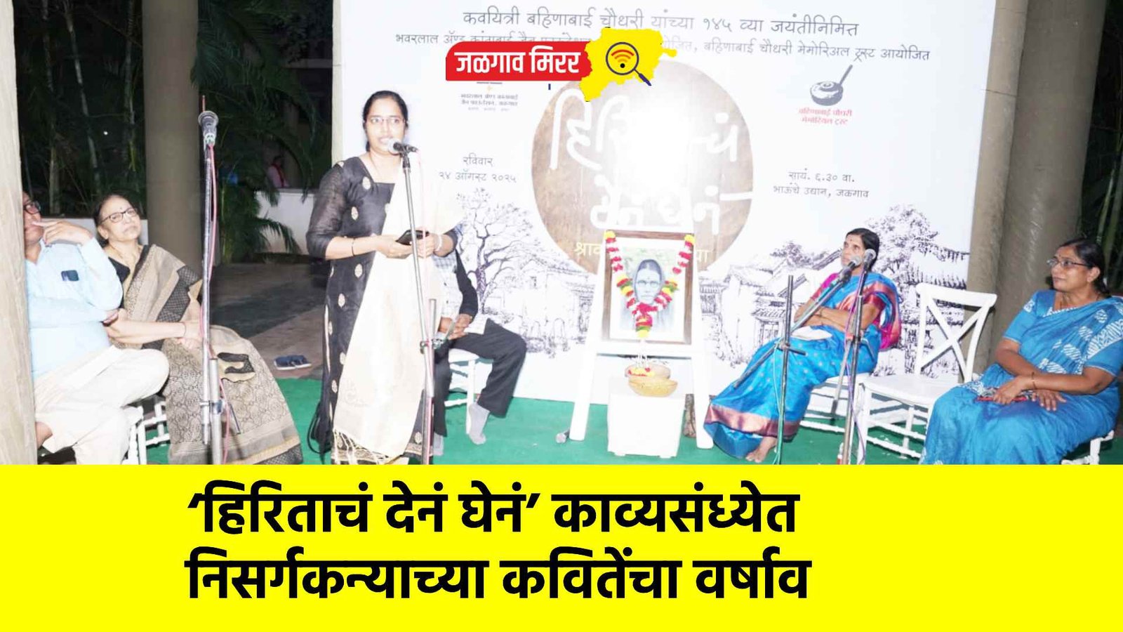 ‘निसर्गकन्या’ म्हणून प्रसिद्ध असलेल्या बहिणाबाईंच्या ओव्या आजही जनमानसात जीवंत आहेत. त्यांच्या काव्य साहित्यातून श्रमजीवी जीवन, निसर्गाचे सौंदर्य, स्त्रियांचे भावविश्व आणि ग्रामीण संस्कृती यांचे प्रतिबिंब ‘हिरिताचं देनं घेनं’ या श्रावण काव्यसंध्येत उमटले. बहिणाबाई चौधरी मेमोरियल ट्रस्ट व भवरलाल अॅण्ड कांताबाई जैन फाऊंडेशनच्या वतीने कवयित्री बहिणाबाई चौधरी यांच्या १४५व्या जयंतीनिमित्त ‘हिरिताचं देनं घेनं’ या विशेष कार्यक्रमाचे आयोजन केले होते. ही श्रावण काव्यसंध्या भाऊंचे उद्यान येथे संपन्न झाली.