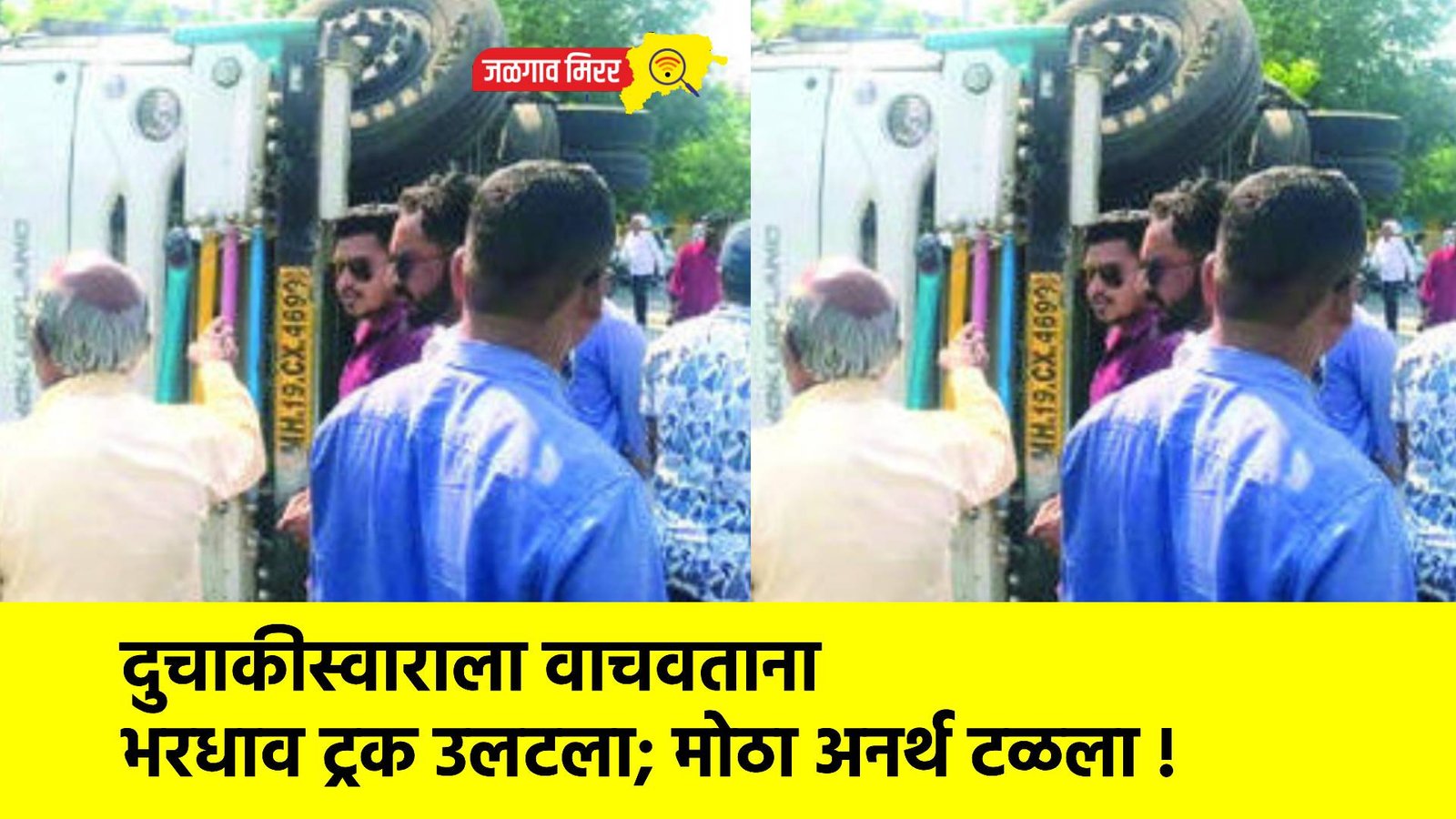 मिळालेल्या माहितीनुसार, भडगावकडून पहुरकडे जाणारी ट्रक (एमएच-१९, सीएक्स-४६९९) दुपारी सुमारे १२ वाजेच्या सुमारास पाचोरा बायपासवरून जात होती. यावेळी विकास कॉलनीकडून अचानक एक दुचाकीस्वार रस्त्यावर आला. त्याला वाचवण्यासाठी ट्रक चालकाने वळण घेतले, मात्र ट्रक वेगात असल्याने नियंत्रण सुटले. ट्रकने प्रथम दुभाजक व विजेच्या खांबाला जोरदार धडक दिली. त्यानंतर ट्रक विरुद्ध दिशेला जाऊन उलटली. अपघातावेळी समोरून येणाऱ्या दोन दुचाकींवरील चार जण थोडक्यात बचावले.
