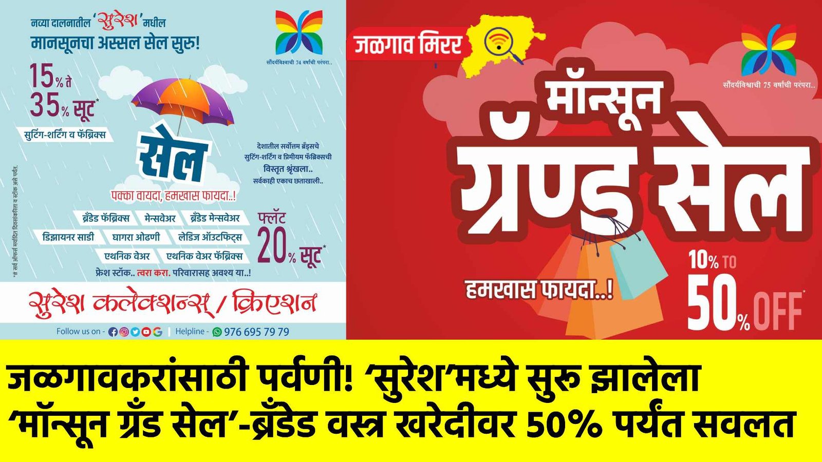 खान्देशातील कपड्यांची आणि दर्जेदार ब्रँड्सची परंपरा असलेले ‘सुरेश’ कपड्यांचे भव्य दालन आपल्या ग्राहकांसाठी घेऊन आले आहे खास मॉन्सून ग्रँड सेल. या सेलमध्ये १०% ते ५०% पर्यंत जबरदस्त सवलती देण्यात येत आहेत. ग्राहकांचा प्रचंड प्रतिसाद लक्षात घेता, या वर्षी सेल अधिक आकर्षक आणि भव्य स्वरूपात सादर करण्यात आला आहे. या ग्रँड सेलचे विशेष आकर्षण म्हणजे तो पार पडतोय सुरेशच्या नव्या, सात मजली भव्य दालनात, जिथे एकाच छताखाली संपूर्ण कुटुंबासाठी वस्त्र व फॅशन साहित्य उपलब्ध आहे.