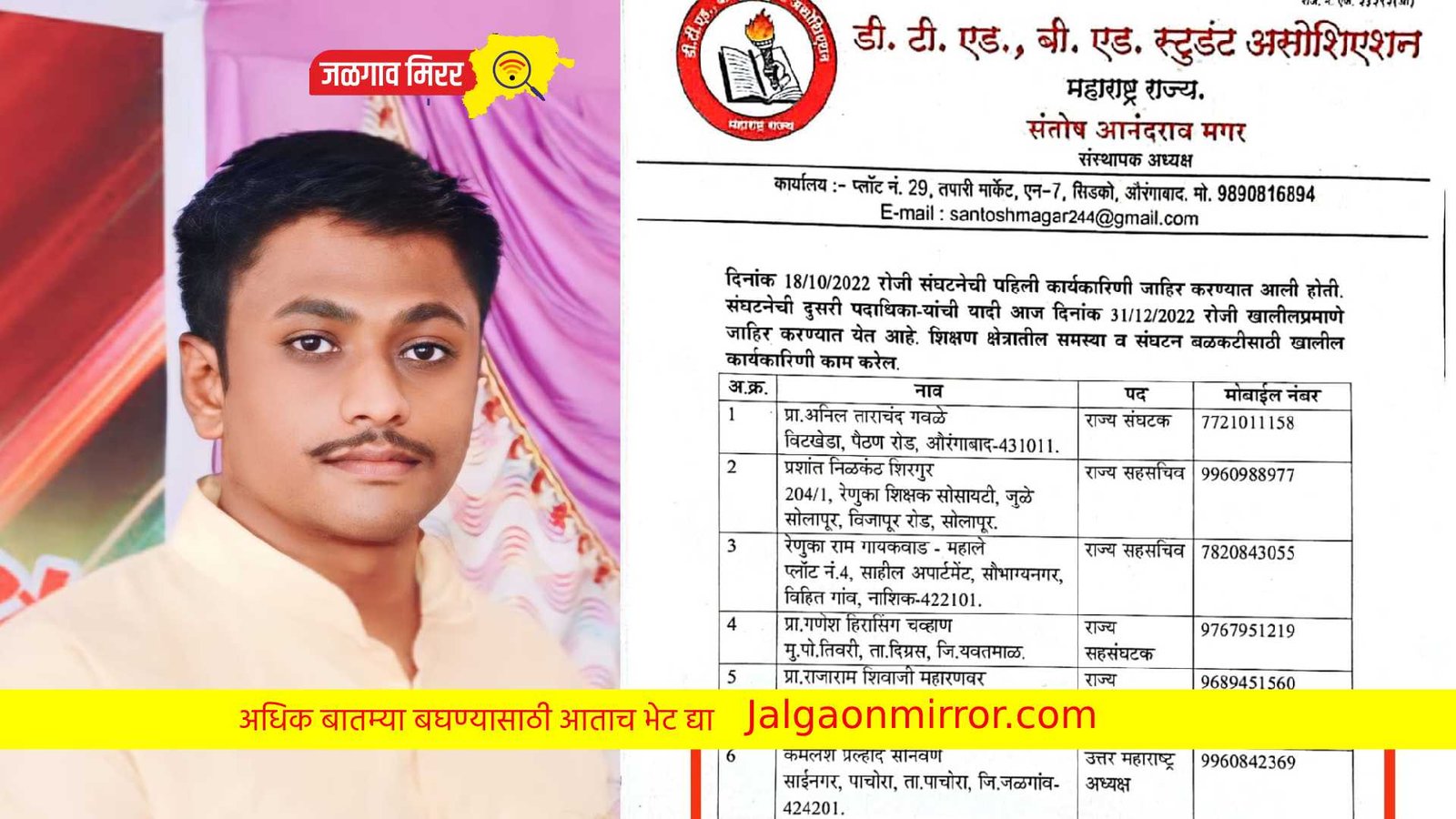 31 डिसेंबर रोजी झालेल्या डी. टी. एड., बी. एड. स्टुडंट असोसिएशनच्या राज्यस्तरीय सभेमध्ये संस्थापक अध्यक्ष संतोष मगर यांनी पाचोरा येथील कमलेश सोनवणे यांची असोसिएशनच्या उत्तर महाराष्ट्र अध्यक्षपदी नियुक्ती केली.