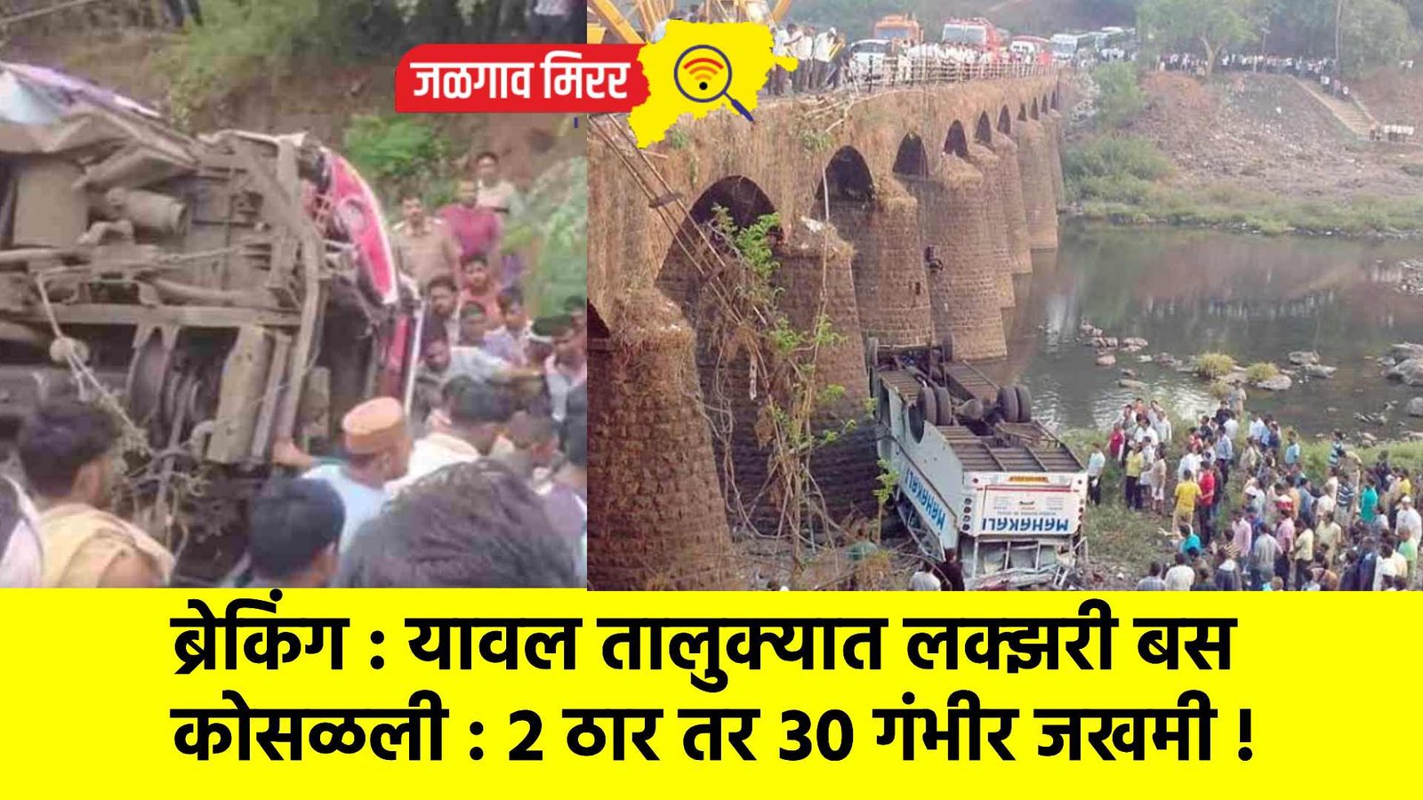 जिल्ह्यातील अनेक रस्त्यावर भीषण अपघाताच्या घटना घडत असतांना आता यावल तालुक्यातील फैजपूर-अमोदा मार्गावरील मोर नदीच्या पुलाजवळ रविवारी सकाळी एक खाजगी लक्झरी बस गणेश ट्रॅव्हल्स क्रमांक एमपी.३०.९००९ पलटी होऊन भीषण अपघात घडला. ही बस इंदोरहून भुसावळकडे येत असताना सकाळी सुमारे १५ फूट खोल नदीपात्रात कोसळली. या दुर्घटनेत दोन प्रवासी ठार झाल्याची माहिती असून २५ ते ३० प्रवासी गंभीर जखमी झाली असल्याची माहिती समोर आली आहे.