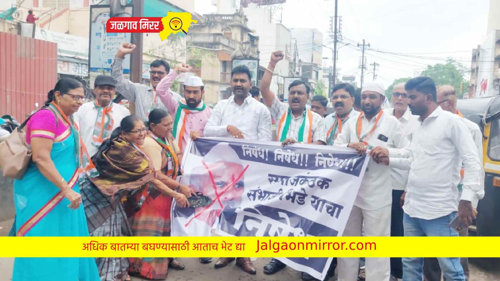 शहरातील काँग्रेस कार्यालयासमोर जळगाव जिल्हा युवक काँग्रेस व शहर काँग्रेसच्या वतीने अमरावती जिल्ह्यातील बडनेरा येथे मनोहर कुलकर्णी म्हणजेच भिडे गुरुजी यांनी राष्ट्रपिता महात्मा गांधी यांच्या बद्दल अवमानकारक केलेल्या बेतल वक्तव्याच्या निषेधार्थ भिडे गुरुजी यांच्या प्रतिमेला जोडे मारून निषेध आंदोलन करण्यात आले.