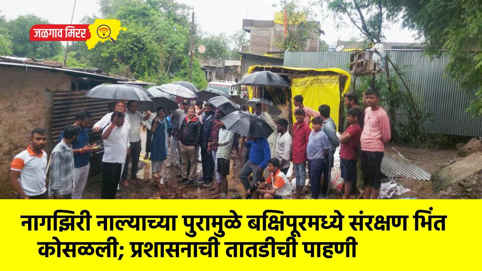 रावेर तालुक्यातील बक्षिपूर गावात जोरदार पावसामुळे आलेल्या नागझिरी नाल्याच्या प्रचंड पाण्याच्या प्रवाहामुळे गावातील जुनी संरक्षण भिंत कोसळली. या घटनेमुळे परिसरातील नागरिकांमध्ये भीतीचे वातावरण निर्माण झाले आहे.