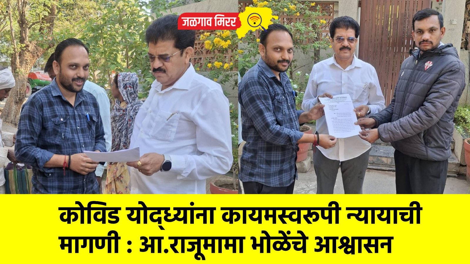 कोविड-१९ महामारीच्या काळात जीव धोक्यात घालून सेवा बजाविलेल्या कंत्राटी कर्मचाऱ्यांसाठी न्याय मिळावा, अशी मागणी जनसेवा विचारधारा फाऊंडेशन यांनी २ मार्च २०२६ रोजी आमदार राजूमामा भोळे यांच्याकडे निवेदन देऊन केली. यावेळी आमदारांनी अधिवेशनात या कंत्राटी कोविड कर्मचाऱ्यांच्या मागण्यांवर लक्षवेधी प्रश्न उपस्थित करून सकारात्मक पावले उचलण्याचे आश्वासन दिले.