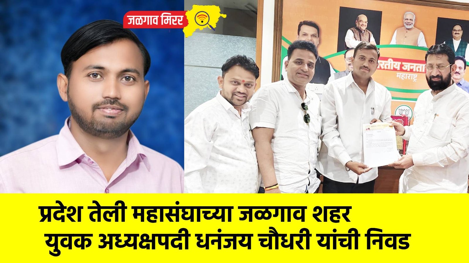 प्रदेश तेली महासंघाच्या जळगाव शहर युवक अध्यक्षपदी धनंजय दिलीप चौधरी यांची सर्वानुमते निवड करण्यात आली आहे. शहरातील सामाजिक, धार्मिक व सांस्कृतिक उपक्रमांमध्ये नेहमीच आघाडी घेत असलेल्या छत्रपती शिवाजी महाराज नगर येथील रहिवासी धनंजय चौधरी यांच्या निवडीचे समाजात स्वागत करण्यात येत आहे.