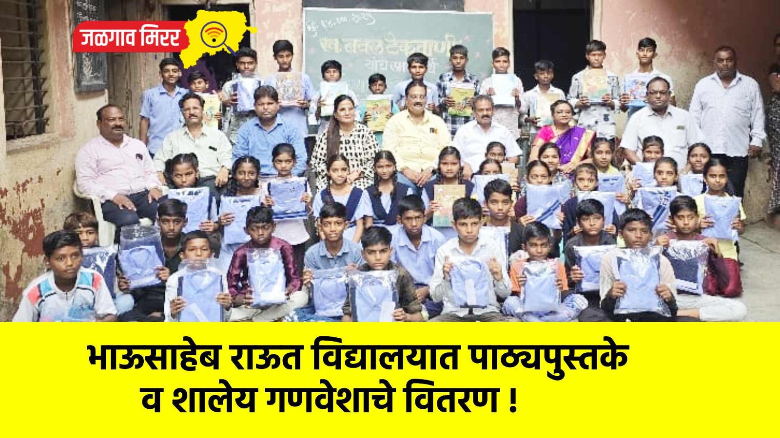 जळगाव येथील भाऊसाहेब राऊत विद्यालयात पाठ्यपुस्तके व शालेय गणवेशाचे वितरण करण्यात आले कार्यक्रमाच्या अध्यक्षस्थानी संस्थेचे उपाध्यक्ष माजी नगरसेवक आप्पासाहेब कैलास सोनवणे तर प्रमुख अतिथी म्हणून साई सेवा परिवाराचे श्री.प्रकाश टेकवाणी, साई महिला मंडळाच्या सौ.कल्पना टेकवाणी, विद्यालयाचे मुख्याध्यापक श्री.एल.एस.तायडे, श्री.शशिकांत रायसिंग, सौ. प्रमोदिनी सोनवणे, श्री.अरुणकुमार बाविस्कर यांची उपस्थिती होती.