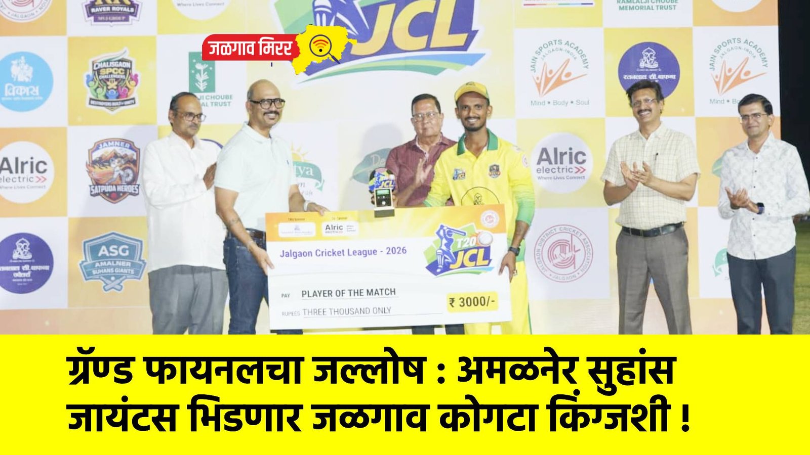 जळगाव क्रिकेट लीग २०२६ चा बहुप्रतिक्षित ग्रॅण्ड फायनल सामना आज रविवारी संध्याकाळी ६ वाजता जैन ड्रीम स्पेसेस च्या मैदानावर रंगणार आहे. अमळनेर सुहांस जायंटस व जळगाव कोगटा किंग्ज या दोन दमदार संघांमध्ये विजेतेपदासाठी टक्कर पाहायला मिळणार आहे. संपूर्ण स्पर्धेत उत्कृष्ट कामगिरी करत अंतिम फेरीत पोहोचलेल्या दोन्ही संघांनी चाहत्यांची उत्सुकता शिगेला पोहोचवली आहे. आता हा थरारक सामना कोण जिंकणार व विजेतेपदाची ट्रॉफी कोण उंचावणार, याकडे सर्वांचे लक्ष लागले आहे.