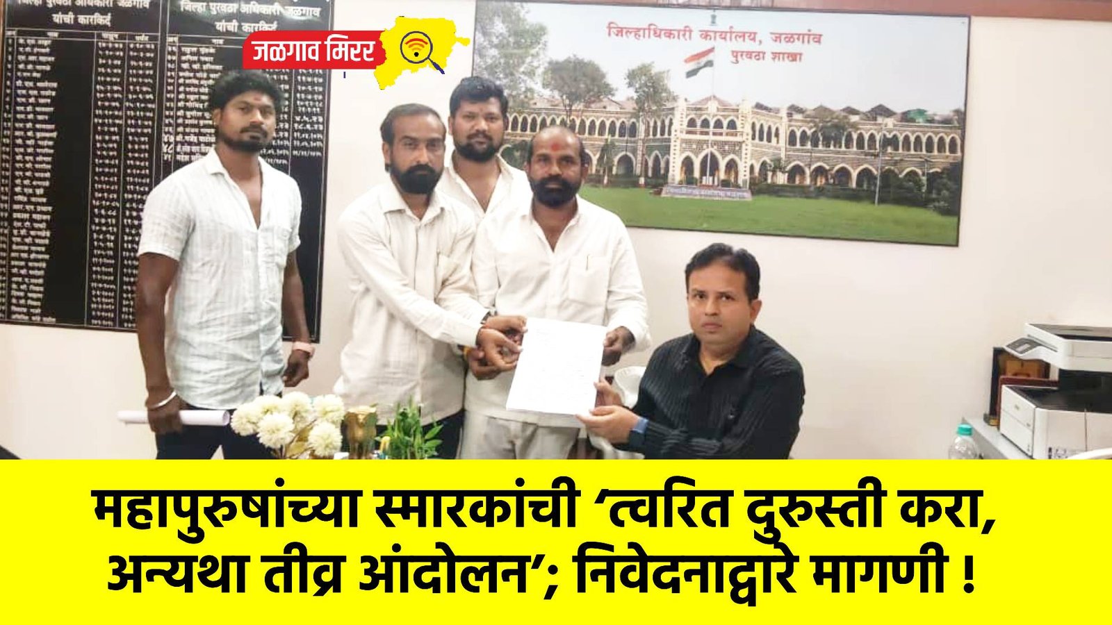 दरम्यान, गोकुळ चव्हाण, विशाल ठाकूर, शहाजी थोरवे, गजू तांबट, संदीप सुरवाडे, विजू कासार, आकाश चव्हाण, अजय कोळी आदींसह कार्यकर्त्यांनी जिल्हाधिकाऱ्यांकडे निवेदन देत तातडीने नवीन पुतळे बसविण्याची मागणी केली आहे. “महापुरुषांच्या स्मारकांची अशी दुर्दशा सहन केली जाणार नाही,” असा इशारा निवेदनात देण्यात आला आहे. या प्रकरणी प्रशासनाची अधिकृत भूमिका समोर येणे अपेक्षित आहे.