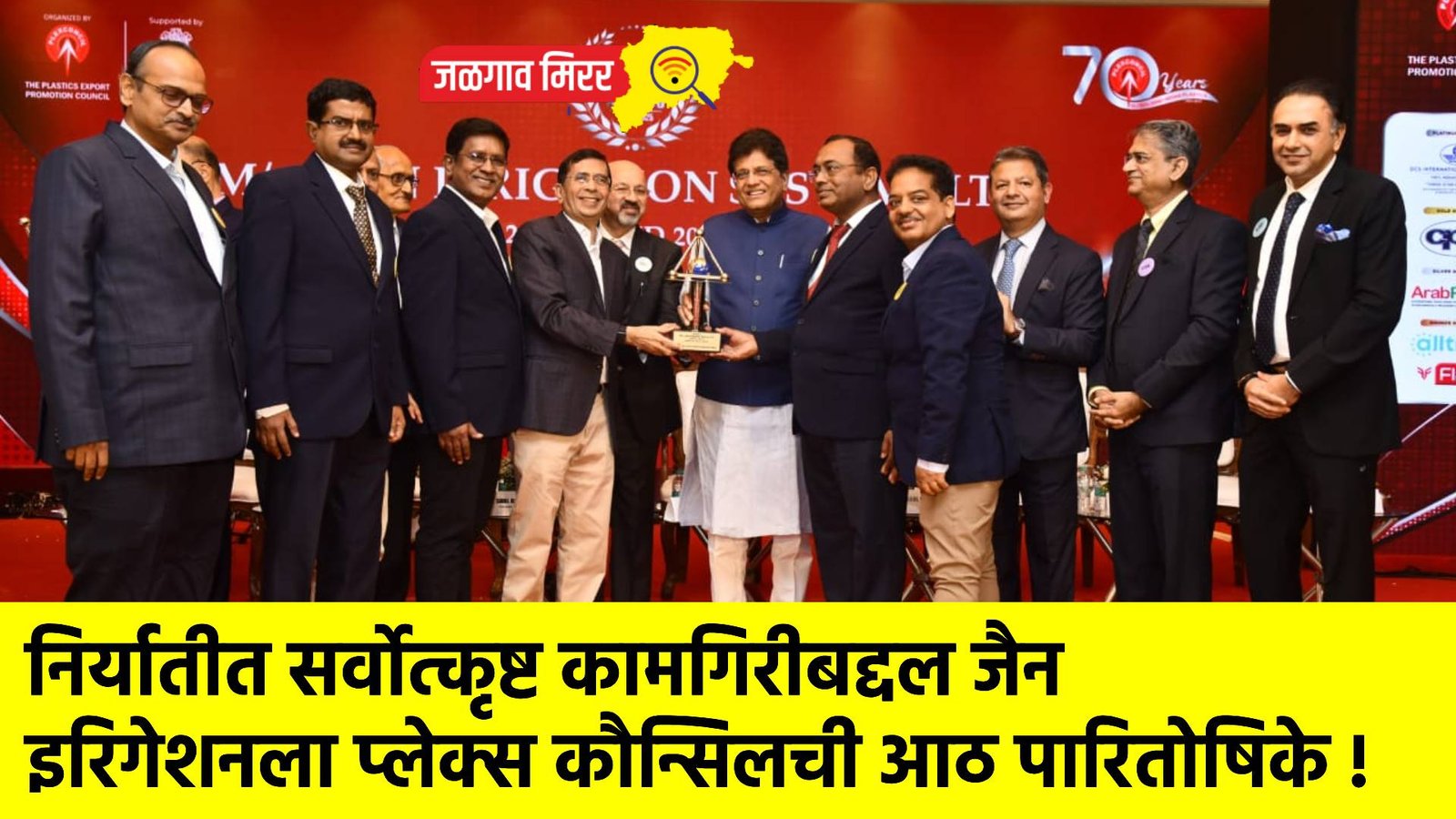 कृषीक्षेत्राला पाईप, ठिबक, माध्यमातून पाणी बचतीतून समृद्धी घडविण्यासाठी मोलाची भूमिका निभावणाऱ्या जागतिक किर्तीच्या जैन इरिगेशन सिस्टीम्स लि. कंपनीला प्लास्टीक उत्पादनांच्या विविध गटांतून २०२३ – २०२४ आणि २०२४-२५ या दोन वर्षासाठी आठ निर्यात पुरस्कार प्रदान करण्यात आले. आज (दि.16) मुंबई येथील हॉटेल द लीला येथे हा पुरस्कार समारंभ झाला. प्लास्टिक एक्सपोर्ट प्रमोशन कौन्सिल (प्लेक्सकॉन्सिल) च्या वतीने देण्यात येणाऱ्या या पुरस्कारामध्ये जैन इरिगेशनने हॅट्रीक केली आहे. केंद्रीय वाणिज्य मंत्री पीयूष गोयल यांच्या हस्ते कंपनीच्या वतीने उपाध्यक्ष अनिल जैन यांनी वरिष्ठ सहकारी डॉ. अनिल पाटील, व्ही. एम. भट, डॉ. बालकृष्ण यादव, राजेंद्र महाजन, एस. एन. पाटील, के. बी. सोनार, सुचिता केरावंत, दिपा शिवदे यांच्यासोबत पुरस्कार स्विकारले.