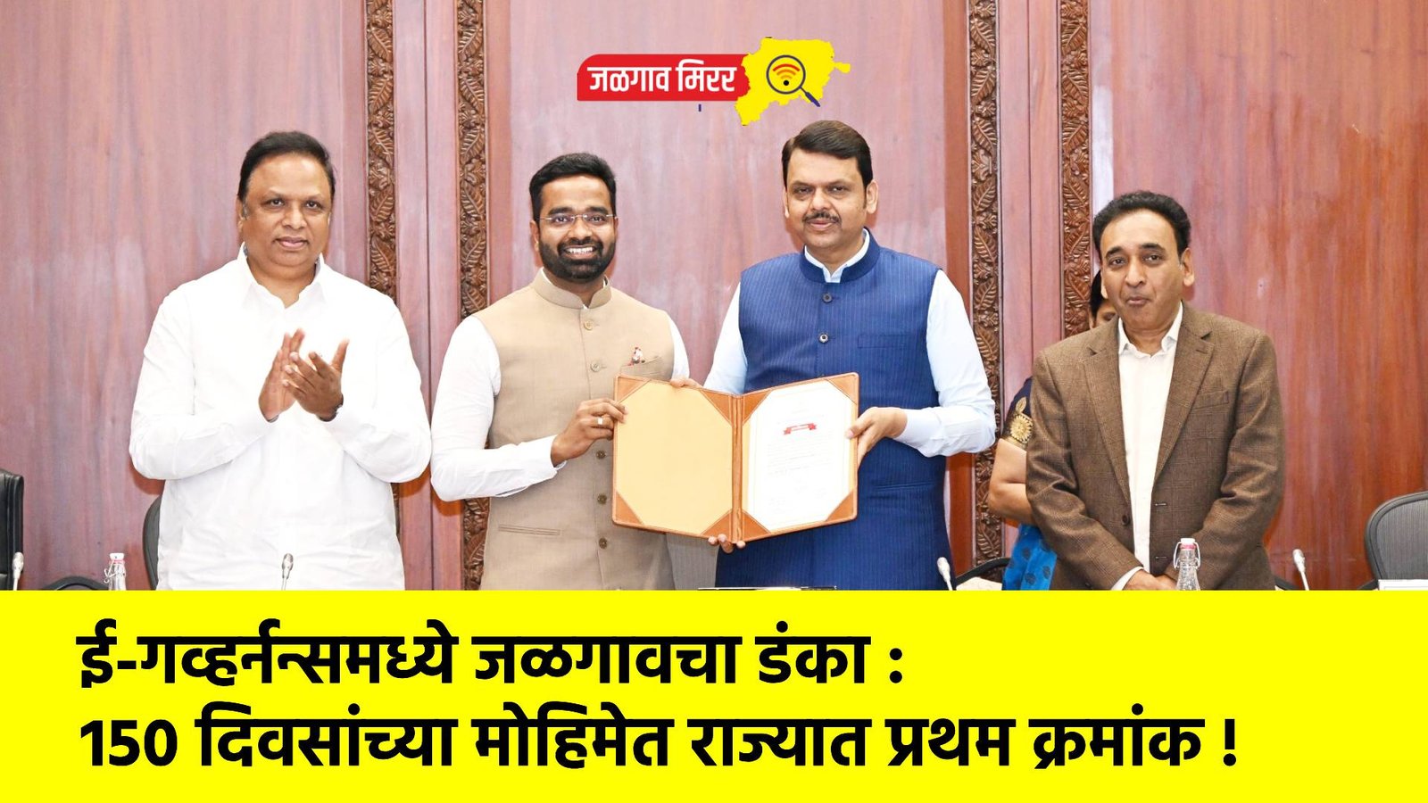 महाराष्ट्र् राज्याचे प्रशासन अधिक लोकाभिमुख, गतिमान आणि पारदर्शक करण्याच्या हेतुने मुख्यमंत्री यांच्या संकल्पनेतुन राबविण्यात आलेल्या १५० दिवसांच्या ई-गव्हर्नन्स सुधारणा कार्यक्रमातंर्गत जळगाव जिल्हाधिकारी कार्यालयाने उल्लेखनीय कामगिरी करत राज्यात प्रथम क्रमांक पटकावला आहे.