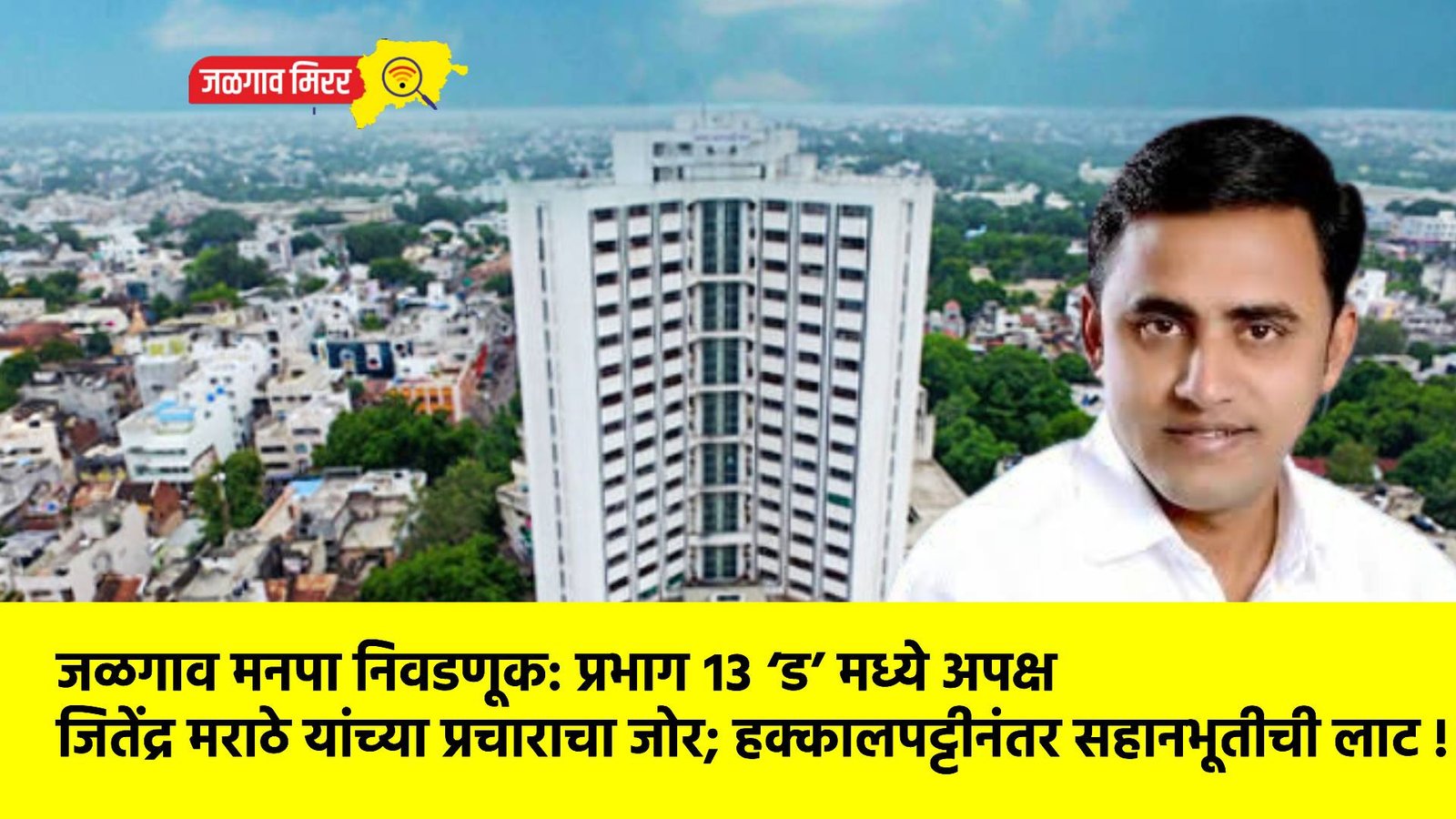 जळगाव महानगरपालिका निवडणुकीच्या प्रचाराला वेग आला असून प्रत्येक प्रभागात लढती अधिक चुरशीच्या होत चालल्या आहेत. अशातच प्रभाग क्रमांक १३ ‘ड’ मध्ये अपक्ष उमेदवार जितेंद्र भगवानराव मराठे यांच्या प्रचाराने राजकीय वातावरण तापले आहे. त्यांच्या प्रचाराला नागरिकांकडून मोठा आणि उत्स्फूर्त प्रतिसाद मिळत असल्याने या प्रभागातील प्रस्थापित समीकरणांवर परिणाम होण्याची चर्चा सुरू झाली आहे.