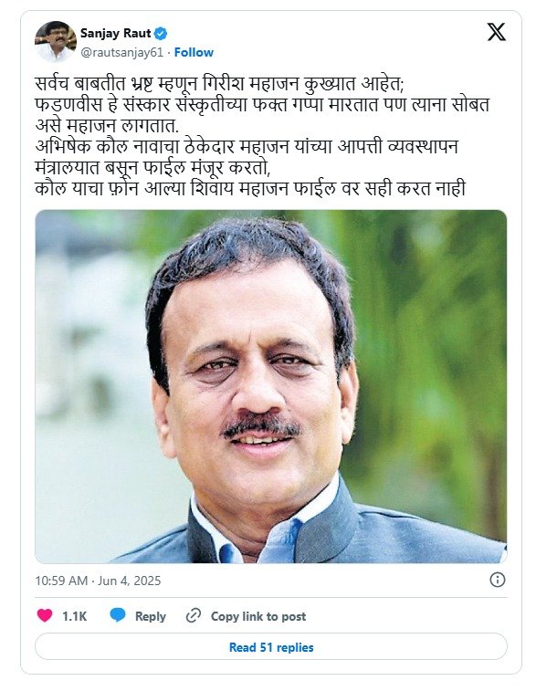 मंत्री महाजन सर्वात भ्रष्ट मंत्री तर अभिषेक कौल ? संजय राऊतांचा खळबळजनक आरोप !