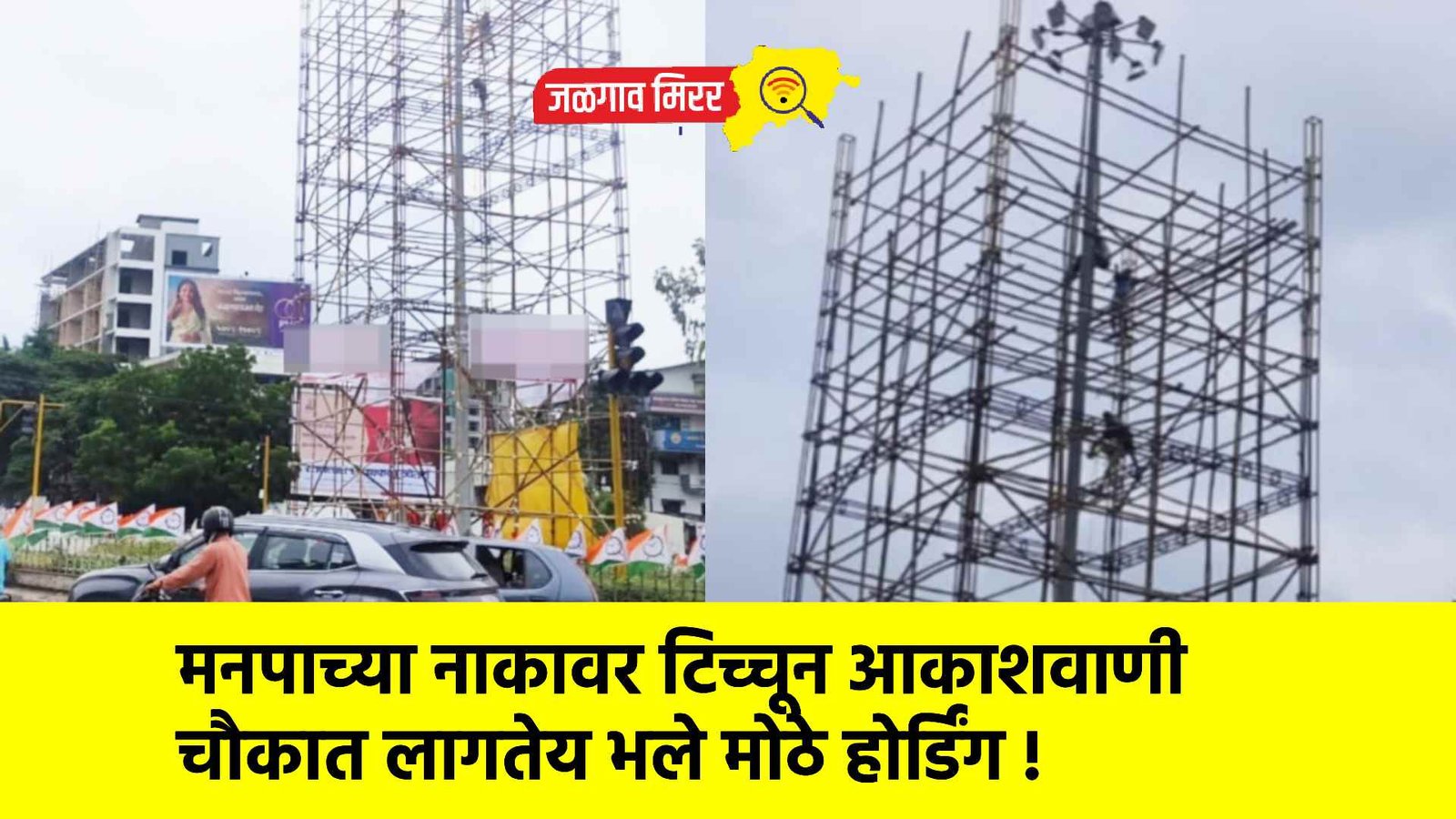 जळगाव शहरातील आकाशवाणी चौक येथे मोठे होर्डिंग गेल्या तीन दिवसापासून काम सुरु आहे मात्र आज दि.१६ ऑगस्ट रोजी मनपाच्या एका अधिकाऱ्याशी संपर्क केला असता. त्यांनी सांगितले कि, या होर्डिंगची नोटीस बनवून ठेवली आहे, मात्र दोन दिवस सुट्टी आल्याने सोमवारी नोटीसवर स्वाक्षरी होवून नोटीस देण्यात येणार आहे. जर सोमवारी नोटीस देणार असाल तो पर्यत त्या होर्डिंगचे काम झाल्यावर होर्डिंग काढण्यात येणार मग मनपा नोटीस देणार कुणाला ?