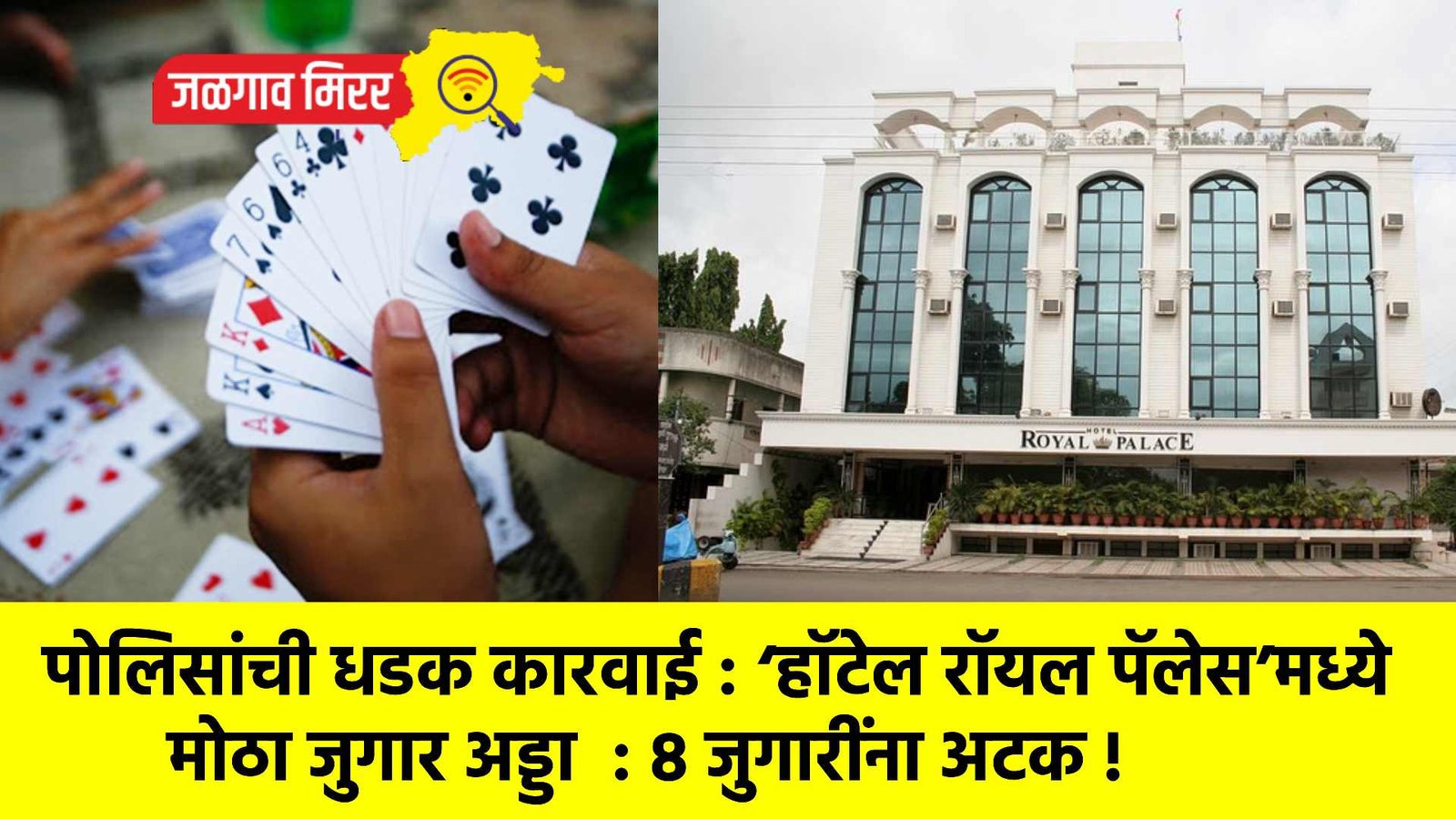 शहरातील अनेक ठिकाणी मोठ्या प्रमाणात अवैध व्यवसाय मोठ्या प्रमाणात सुरु असतांना आता जळगाव जिल्हा पोलीस अधीक्षक डॉ. महेश्वर रेड्डी आणि अपर पोलीस अधीक्षक अशोक नखाते यांच्या सूचनेनुसार, उपविभागीय पोलीस अधिकारी संदीप गावीत यांच्या लेखी आदेशाने स्थानिक गुन्हे शाखेने ‘हॉटेल रॉयल पॅलेस’ येथे छापा टाकून मोठा जुगार अड्डा उद्ध्वस्त केला. या कारवाईत १९ लाख ९७ हजार रुपयांपेक्षा जास्त रोख रक्कम आणि १३ मोबाईल हँडसेटसह ८ जुगारींना अटक करण्यात आली आहे.