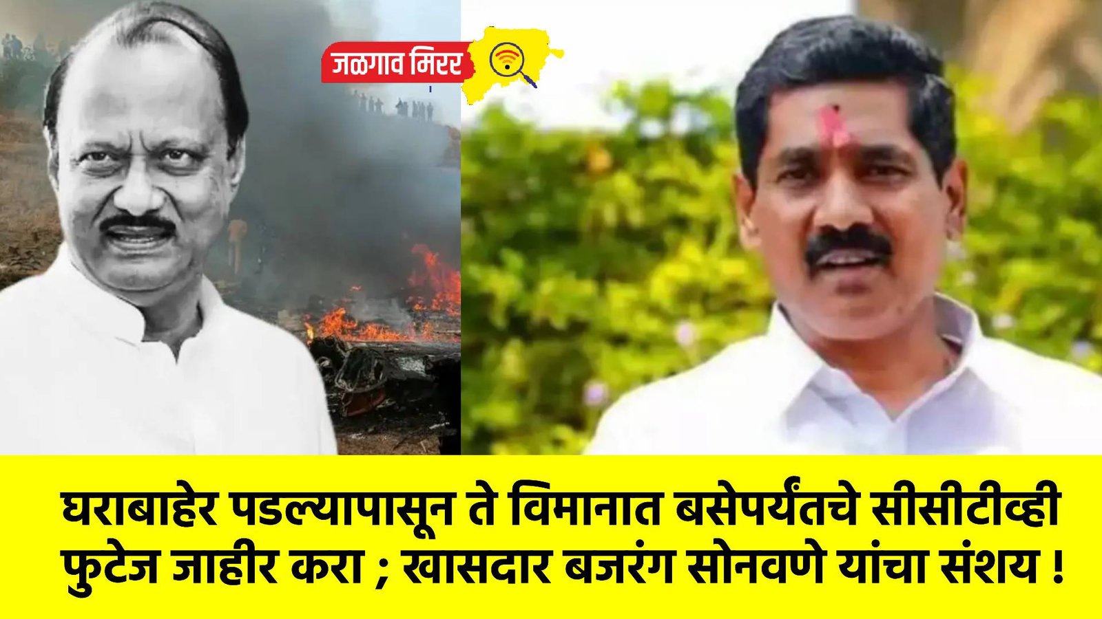 राष्ट्रवादी काँग्रेस (शरदचंद्र पवार गट) चे खासदार बजरंग सोनवणे यांनी उपमुख्यमंत्री अजित पवार यांच्या विमान प्रवासाशी संबंधित घटनेबाबत संशय व्यक्त करत सखोल तपासाची मागणी केली आहे. या प्रकरणात विविध तर्कवितर्क मांडले जात असून, त्यावर स्पष्टता यावी यासाठी अजित पवार घराबाहेर पडल्यापासून ते विमानात बसेपर्यंतचे सीसीटीव्ही फुटेज जाहीर करण्यात यावे, अशी मागणी त्यांनी केली आहे.