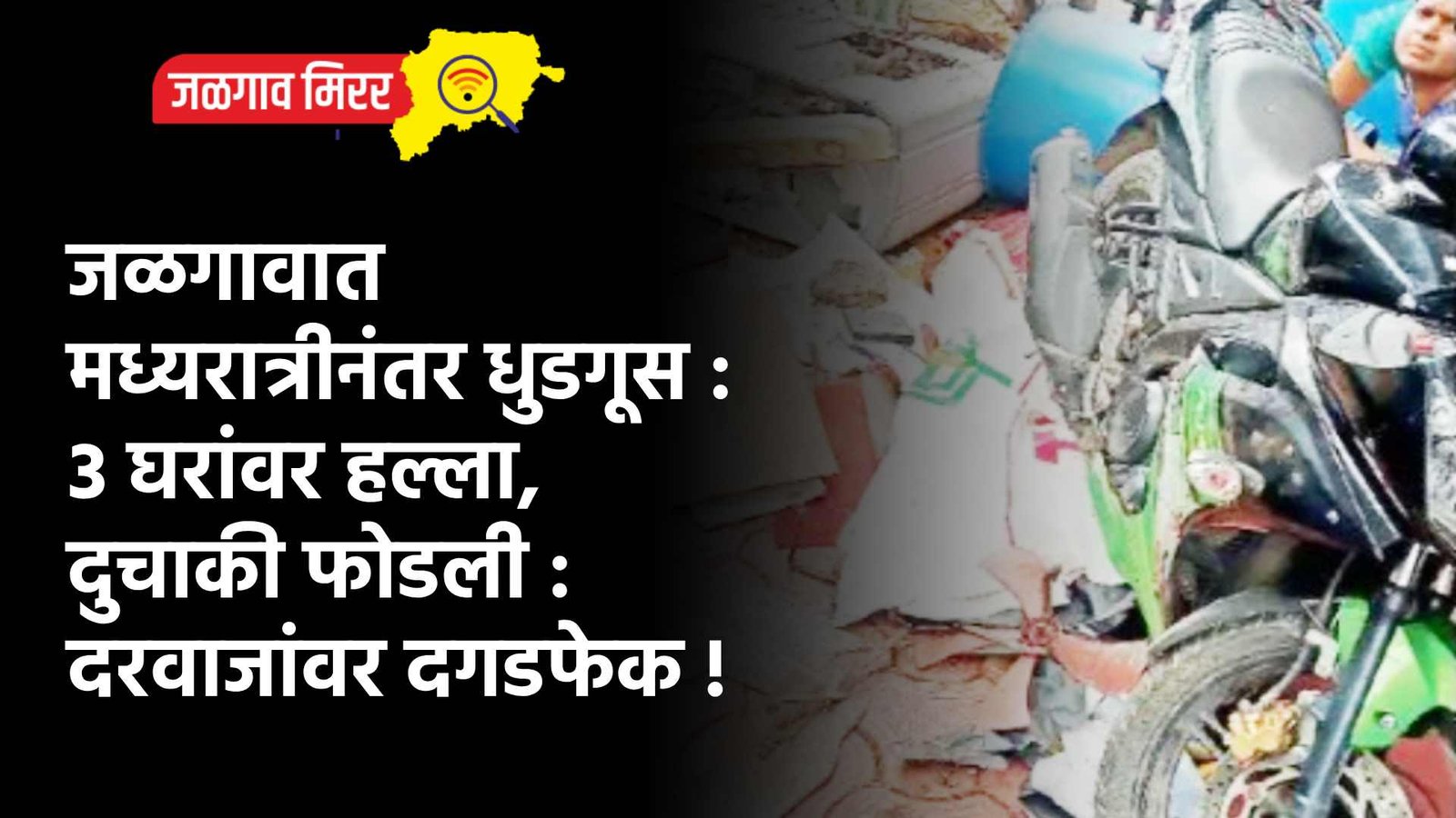 याप्रकरणी शारदा ठाकुर (वय ४०) यांनी दिलेल्या तक्रारीनुसार, सुरेश ओतारी खुनाच्या वादातून संशयित आरोपी स्वप्निल उर्फ गोलू ठाकुर, निशांत चौधरी, अरुण उर्फ टीनू गोसावी, मुन्ना पहिलवान, पारस सोनवणे, बेंडा अज्या, गौरव मिस्तरी आणि ५-६ तरुणांनी बुधवारी मध्यरात्रीनंतर हल्ला केला. त्यावेळी पती सुकलाल आणि दोन मुली घरात झोपले होते. दरवाज्यावर लाठ्या-काठ्या आणि दगडफेक केली. अर्धवट दरवाजा उघडला असता स्वप्निल ठाकुर आणि त्याचे साथीदार दुचाकीवर दिसले. गोलू ठाकूरने शिवीगाळ केली. त्यानंतर कल्पना बाविस्कर यांच्या घराचा दरवाजा तोडून आत घुसले आणि शिवीगाळ केली. तसेच दुचाकीची तोडफोड केली. नंतर सम्राट कॉलनीत सविता महाजन यांच्या घराच्या खिडकीची काच फोडली. याप्रकरणी स्वप्निल ठाकुर, निशांत चौधरी, अरुण गोसावी आदींवर गुन्हा दाखल झाला आहे.