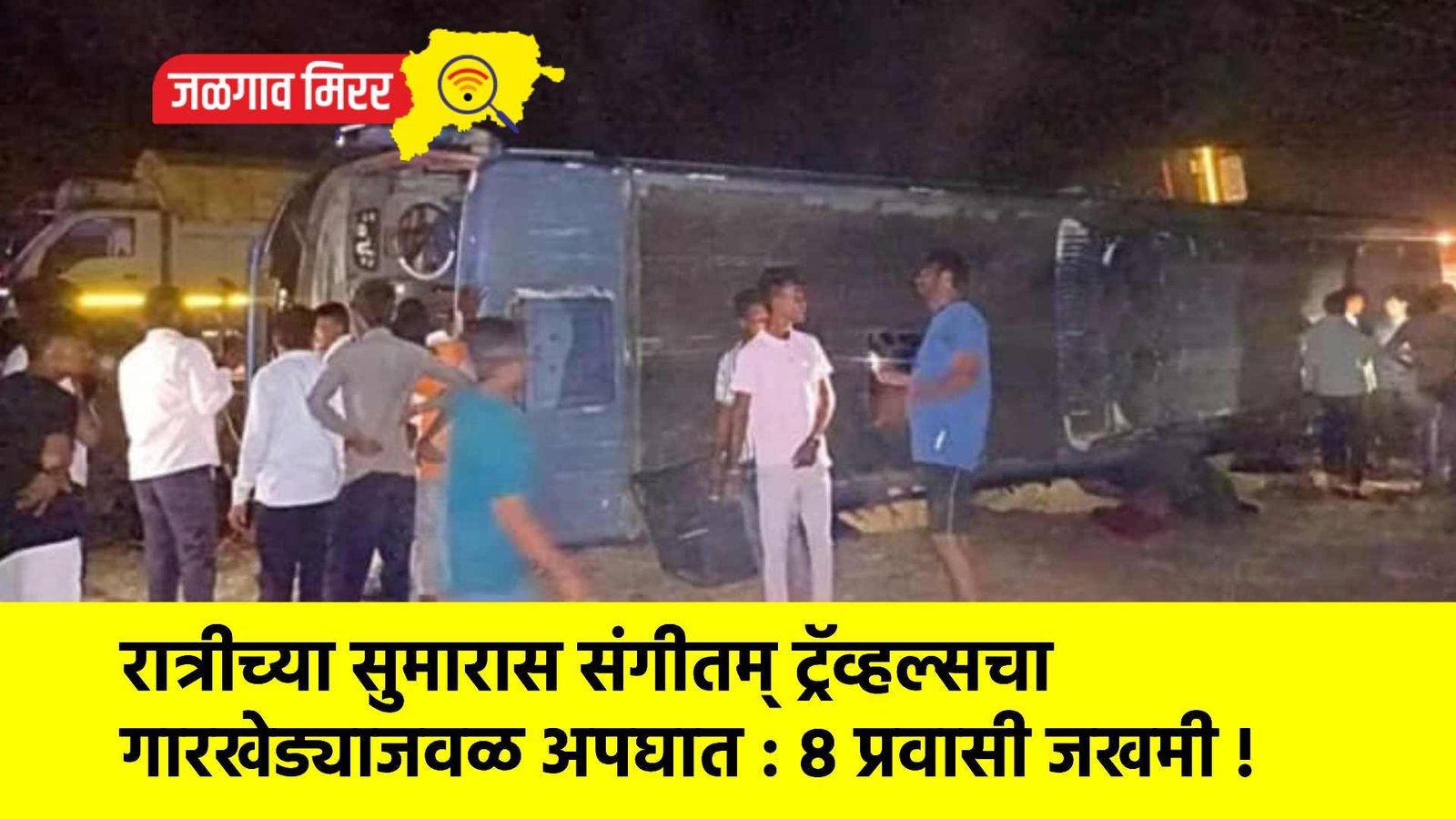 जामनेर तालुक्यातील गारखेडा रोडवरील हॉटेल साई ढाब्याजवळ संगीतम ट्रॅव्हल्स ही खाजगी बस रस्त्याच्या खाली पलटी झाल्याची घटना दि. १ रोजी रात्री ९ वाजेच्या सुमारास घडली. या अपघातात बसमधील ७ ते ८ प्रवासी किरकोळ जखमी झाले आहेत. त्यांना प्राथमिक उपचार करून घरी सोडण्यात आले. या घटनेत सुदैवाने कोणतीही जीवितहानी झालेली नाही. राज्याचे जलसंपदामंत्री गिरीष महाजन यांनी भ्रमणध्वनीवरून घटनेची माहिती जाणून घेतली असून, जखमींना धीर दिला आहे. संगितम ट्रॅव्हल्सची बस (एमएच १९ सीवाय २२२४) भुसावळ येथून २६ प्रवासी घेऊन जामनेरमार्गे पुणे येथे जाण्यासाठी दि. १ रोजी रात्री निघाली होती. ही बस गारखेडा गावाजवळील हॉटेल साई ढाव्याजवळ आल्यावर चालकाचा बस वरील ताबा सुटल्याने ती रस्त्याच्या खाली जाऊन पलटी झाली. त्यात महिला, पुरुष व लहान बालकांसह सुमारे ७ ते ८ प्रवासी किरकोळ जखमी झाले आहेत.