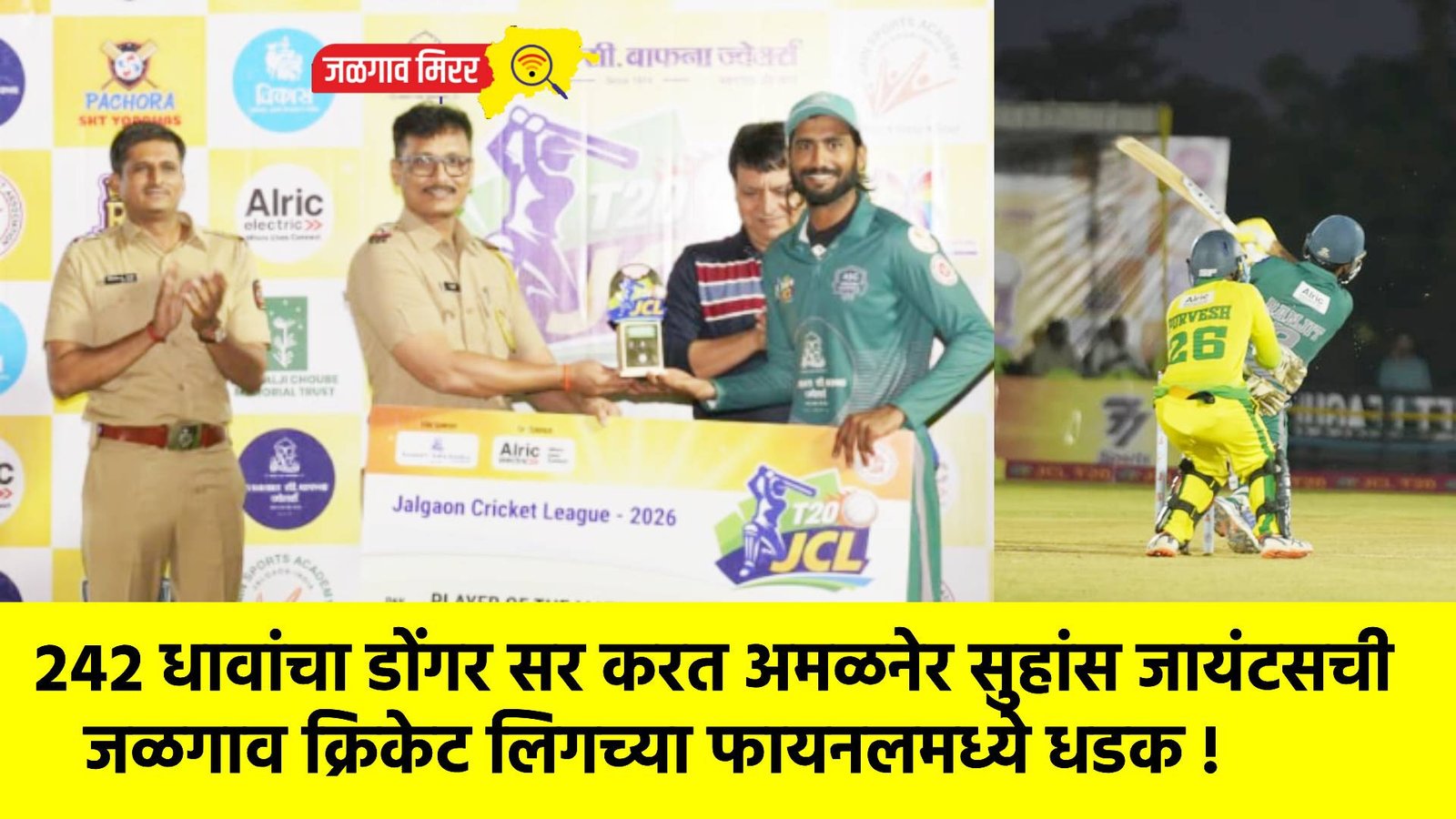 जळगाव जिल्हा क्रिकेट असोसिएशनच्या वतीने व रतनलाल सी. बाफना ज्वेलर्स प्रायोजीत व अलरीक इलेक्ट्रीकल्स सहप्रायोजकत्वाखाली आयोजित जळगाव क्रिकेट लिग-२०२६, JCL T-20 क्रिकेटच्या रविवारी होणाऱ्या ग्रॅण्ड फायनल साठी पहिल्या क्वालिफायर मधून विजयी होत जळगाव कोगटा किंग च्या २४२ धावांचा डोंगर सर करत अमळनेर सुहांस जायंटस ने थाटात प्रवेश केला आहे. रात्री उशिरा सुरू असलेल्या एलिमिनेटर सामन्यातून दुसरा क्वालिफायर साठी संघ ठरेल. दुसरी क्वालिफायर उद्या दि. २५ एप्रिल दुपारी ४ वाजता जैन ड्रीम स्पेसेस या भव्य क्रीडांगणावर होईल.