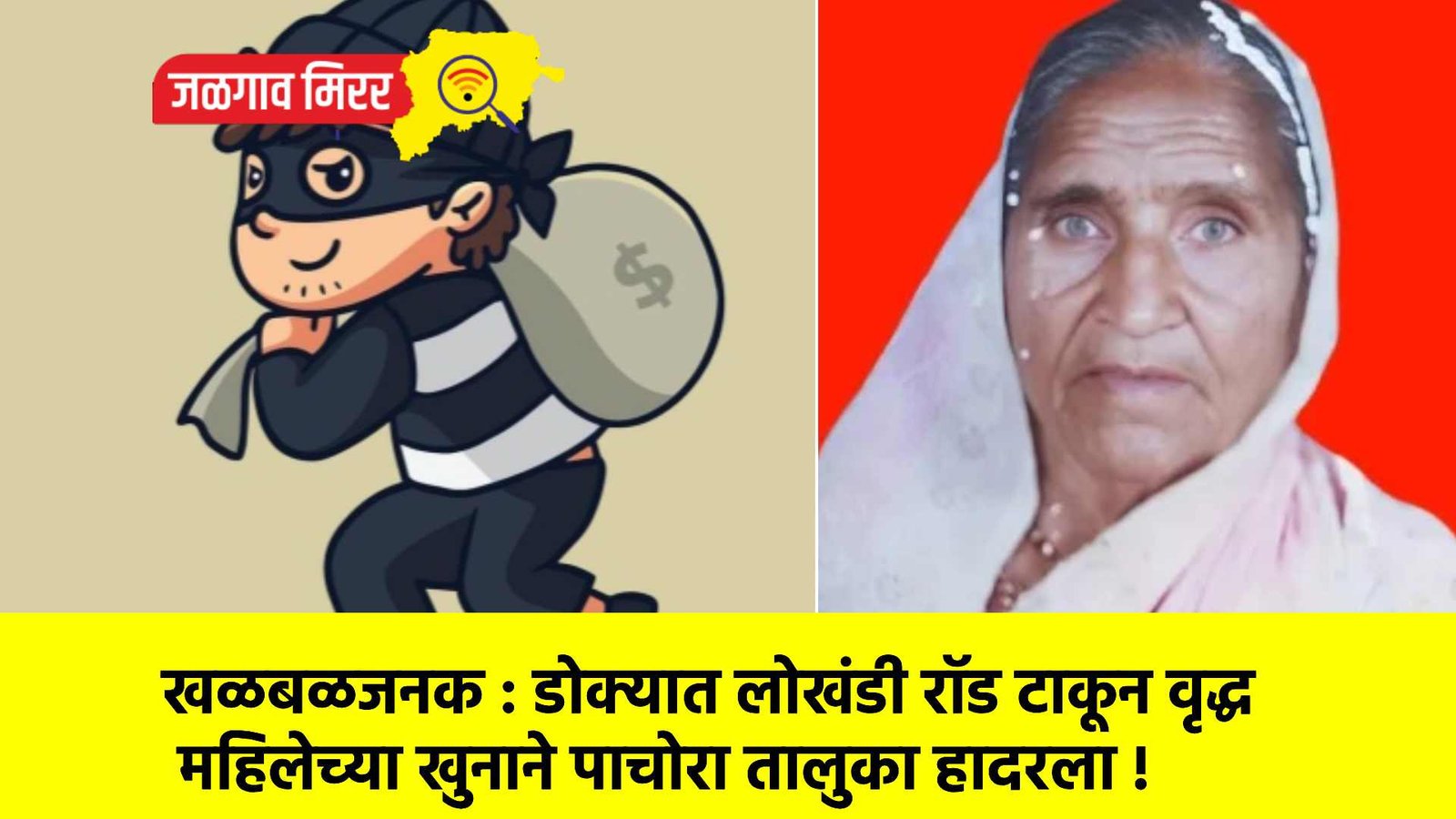 एका ८५ वर्षीय वृद्ध महिलेचा लोखंडी रॉडने डोक्यात वार करून निर्घृण खून करण्यात आल्याची धक्कादायक घटना ५ जून रोजी रात्री ११ वाजण्याच्या सुमारास पाचोरा तालुक्यातील वाडी गावाजवळील शेवाळे येथे एका उघडकीस आली आहे. या घटनेत जनाबाई माहरु पाटील यांचा दुर्देवी मृत्यू झाला आहे. चोरट्यांनी त्यांच्या गळ्यातील मंगळसूत्र आणि कानातील सोन्याच्या बाळ्या ओरबाडून पोबारा केला. या घटनेने पाचोरा तालुक्यात मोठी खळबळ उडाली आहे.