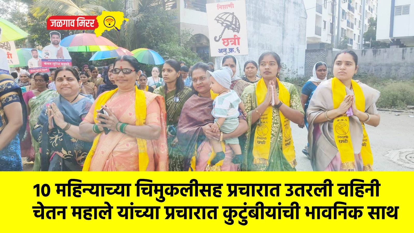 या मिरवणुकीतील सर्वात भावनिक क्षण म्हणजे चेतन महाले यांच्या वहिनी सीमा महाले यांचा सहभाग. त्यांनी आपल्या अवघ्या १० महिन्यांच्या चिमुकलीला कुशीत घेऊन प्रचारात सहभाग नोंदवला. हा क्षण अनेक नागरिकांच्या डोळ्यांत पाणी आणणारा ठरला. “विकासासाठी आणि भविष्यासाठी कुटुंबातील प्रत्येक सदस्य मैदानात उतरला आहे,” असा संदेश या दृश्यातून मिळत होता.