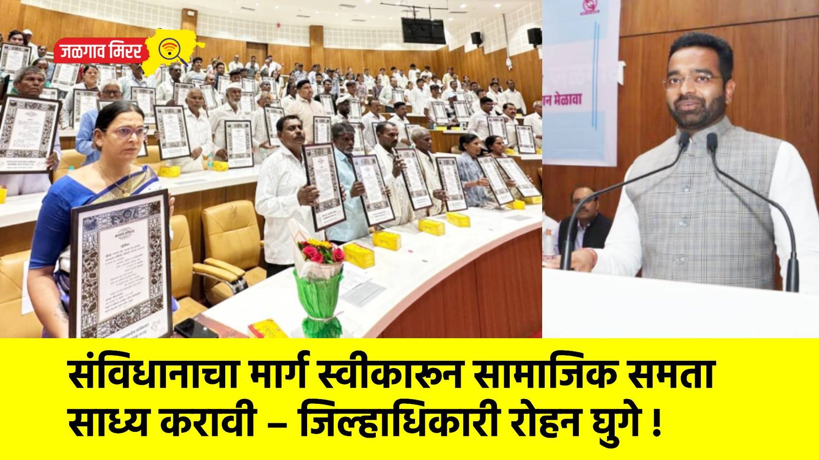 “समाजातील असमानता दूर करण्यासाठी संविधानाचा मार्ग स्वीकारणे ही काळाची गरज आहे,” असे प्रतिपादन जिल्हाधिकारी रोहन घुगे यांनी केले. भारतरत्न डॉ. बाबासाहेब आंबेडकर यांच्या जयंतीनिमित्त अभिवादन कार्यक्रम तसेच कर्मवीर दादासाहेब गायकवाड सबळीकरण व स्वाभिमान मेळावा जिल्हाधिकारी कार्यालयातील नियोजन भवन येथे आयोजित करण्यात आला होता त्यावेळी जिल्हाधिकारी बोलत होते.