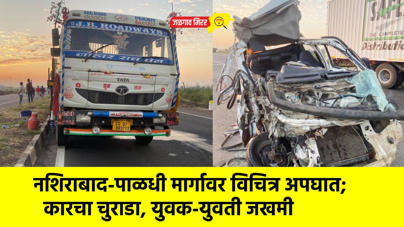 या विचित्र अपघातात चारचाकी वाहनाच्या पुढील भागाचा पूर्णपणे चुराडा झाला असून यश रमेश शिंपी (वय २३, रा. पाळधी, ता. धरणगाव) व पल्लवी छाडीकर (वय २०, रा. मेहरुण) हे दोघे जण जखमी झाले. दोघांच्याही हाताला गंभीर दुखापत झाली असून तरुणाच्या पायालाही मार लागला. या विचित्र अपघाताची माहिती मिळताच तालुका पोलीस ठाण्याचे कर्मचारी घटनास्थळी दाखल झाले. त्यांनी ट्रेलर चालकाची चौकशी करीत अपघातग्रस्त वाहने पोलीस ठाण्यात आणली. याप्रकरणी रात्री उशिरापर्यंत पोलीसात कुठलीही नोंद करण्यात आलेली नव्हती.