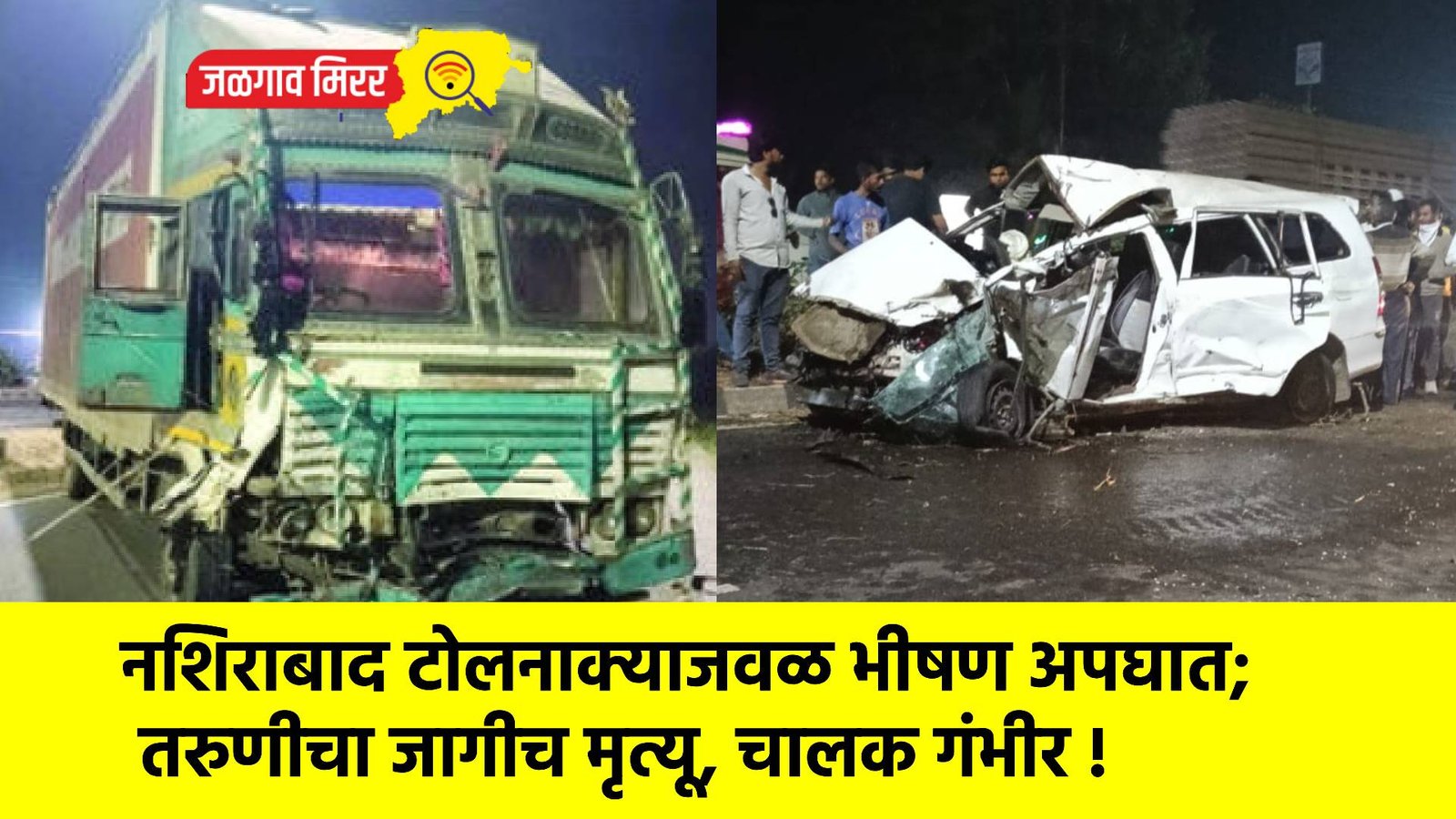 सविस्तर वृत्त असे कि, जळगावकडून भुसावळकडे जाणारी इनोव्हा कार (एमएच १९, बीयू- ७१८६) चा गुरुवारी रात्री ८.३० च्या सुमारास जळगाव ते भुसावळ महामार्गावरील नशिराबादजवळ भीषण अपघात झाला. दरम्यान, चालकाचा ताबा सुटल्याने इनोव्हा कारने महामार्गावरील डिव्हायडर तोडत थेट विरुद्ध दिशेने जाऊन समोरून येणाऱ्या कंटेनर (जीजे ०१, डीएक्स-९४९७) ला जबर धडक दिली. या भीषण अपघातात इनोव्हा कारमध्ये असलेल्या झोया नदीम पठाण (वय २२) या महिलेचा जागीच मृत्यू झाला. तर भुसावळ येथील सोना डेअरीचे संचालक यांचा मुलगा अरबान खान (वय २६) हा गंभीर जखमी झाला आहे. गंभीर जखमी असलेल्या अरबान खान यास तातडीने उपचारार्थ गोदावरी रुग्णालयात दाखल करण्यात आले आहे.