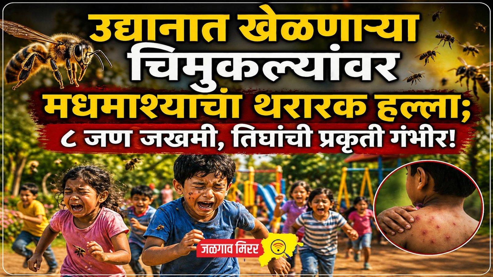 मिळालेल्या माहितीनुसार, गोदावरीनगरातील अनिल महाजन यांच्या मुलाच्या हळदीचा कार्यक्रम २६ एप्रिल रोजी पार पडला. यानिमित्त रावेर तालुक्यातील निंबोल, कुंभारखेडा येथून नातेवाईक व वऱ्हाडी मंडळी मोठ्या संख्येने महाजन यांच्याकडे आली होती. कार्यक्रमानंतर सायंकाळच्या सुमारास मुले घराजवळील उद्यानात खेळण्यासाठी गेली होती. सायंकाळी साडेसहा वाजेच्या सुमारास उद्यानातील मधमाश्यांचे पोळ अचानक उठले. मधमाश्यांनी खेळत असलेल्या मुलांवर हल्ला केला. अचानक झालेल्या या हल्ल्यामुळे मुले आरडाओरड करत सैरावैरा पळू लागली. हा प्रकार लक्षात येताच अनिल महाजन व मयूर पाटील यांनी तत्काळ धाव घेत मुलांना वाचविण्याचा प्रयत्न केला, मात्र तेही मधमाश्यांच्या हल्ल्यात जखमी झाले. या प्रकारामुळे परिसरात काही काळ भीतीचे वातावरण निर्माण झाले होते.