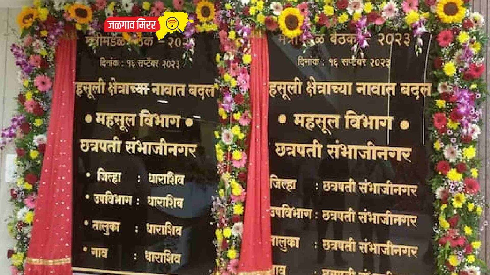 यावेळी उपमुख्यमंत्री फडणवीस, उपमुख्यमंत्री पवार आणि मंत्रिमंडळातील सहकारी उपस्थित होते. यावेळी छत्रपती संभाजीनगर आणि धाराशिव महसुली विभाग, जिल्हा, तालुका, गाव या नामकरण फलकाचे अनावरण मुख्यमंत्री शिंदे यांच्या हस्ते झाले. यावेळी दिलेल्या छत्रपती शिवाजी महाराज की जय…छत्रपती संभाजी महाराज की जय या जयघोषामुळे परिसर दुमदुमला असल्याचे पाहायला मिळाले.