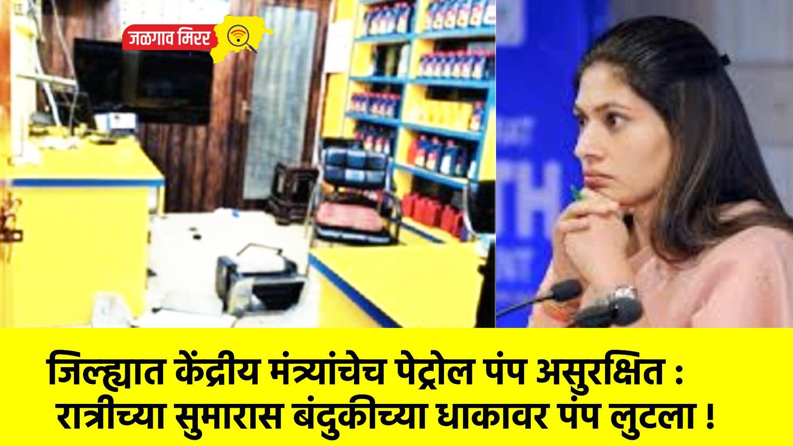 गेल्या काही महिन्यापासून जळगाव जिल्ह्यतील अनेक ठिकाणी चोरीच्या घटना सातत्याने वाढत असताना आता थेट जिल्ह्यातील केंद्रीय राज्यमंत्री रक्षाताई खडसे यांचेच पेट्रोल पंप असुरक्षित असल्याची घटना घडली आहे. केंद्रीय क्रीडा राज्यमंत्री रक्षा खडसे यांच्या मालकीच्या रक्षा ऑटो फुएल्स या मुक्ताईनगरातील पेट्रोल पंपावर दरोडा टाकण्यात आला. यात दोन कर्मचाऱ्यांना बंदुकीचा धाक दाखवत मारहाण करीत तोडफोड करण्यात आली. जवळपास एक लाख रुपयांची रोकड लंपास करण्यात आली. ही थरारक घटना राष्ट्रीय महामार्गावर गुरुवारी रात्री १०:४५ वाजेच्या सुमारास घडली.