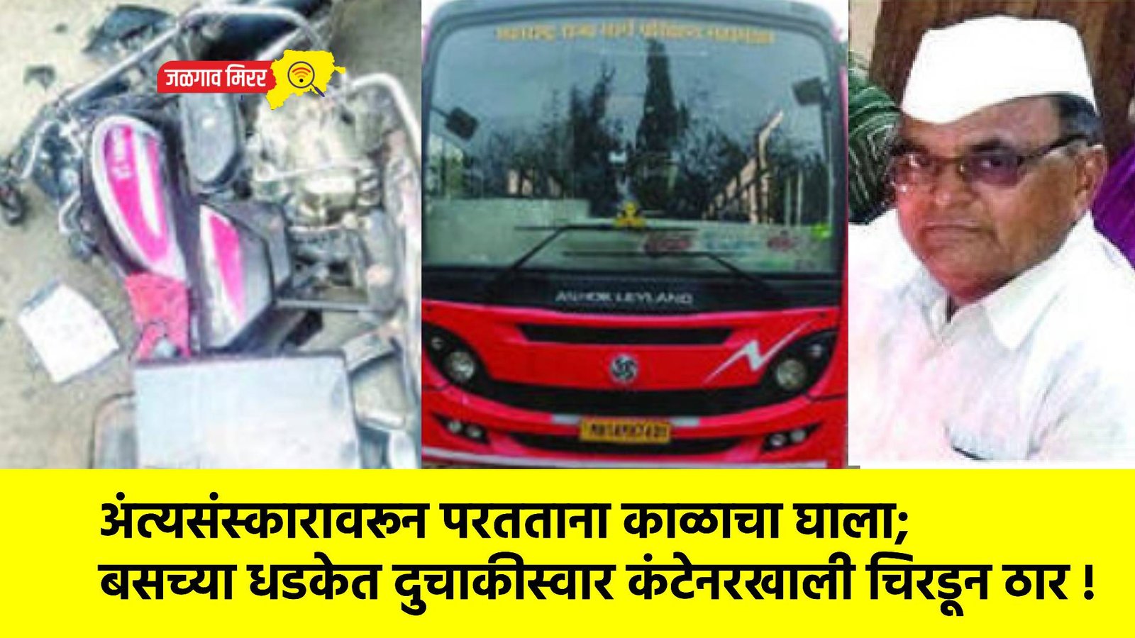 भावजयीच्या अंत्यसंस्काराहून माघारी परतणाऱ्यास बसने धडक दिली. त्यामुळे दुचाकीवरील नियंत्रण सुटल्याने प्रल्हाद अमृत बाविस्कर (वय ६०, रा. मन्यारखेडा, ता. भुसावळ) हे समोरुन येणाऱ्या कंटेनरखाली येवून चिरडल्या गेल्याने त्यांचा दुर्देवी मृत्यू झाला. या अपघातात त्यांची पत्नी सुनीताबाई बाविस्कर या गंभीर जखमी झाल्या. ही घटना शनिवार दि. १७ रोजी दुपारच्या सुमारास कंडारी फाट्यावर घडली. पोलिसांनी अपघातग्रस्त वाहने जप्त केली आहे.