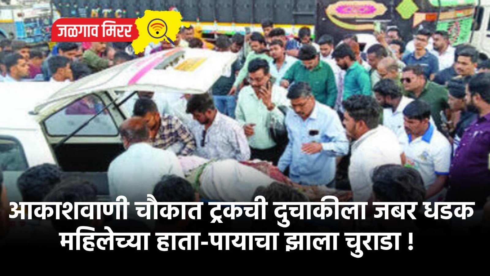 उपचारासाठी दुचाकीवरुन येत असलेल्या दाम्पत्याच्या दुचाकीला मागून येत असलेल्या लोखंडी अँगलने भरलेल्या ट्रकने धडक दिली. दुचाकीस्वार असलेल्या रागिणी चंपालाल पाटील (वय ४५, रा. साईनगर, भुसावळ) या ट्रकच्या मागील चाकाखाली आल्यामुळे गंभीर जखमी झाल्या. ट्रकचे चाक त्यांच्या अंगावरुन गेल्याने त्यांचा एक हात तुटून पडला होता तर पायाचा अक्षरशः चेंदामेंदा झाला होता. ही घटना गुरुवारी सायंकाळी साडेपाच वाजेच्या सुमारास आकाशवाणी चौकात घडली. महामार्गावरील ही २४ तासातील दूसरी घटना घडल्यामुळे लोकप्रतिनिधींबद्दल रोष व्यक्त केला जात होता.