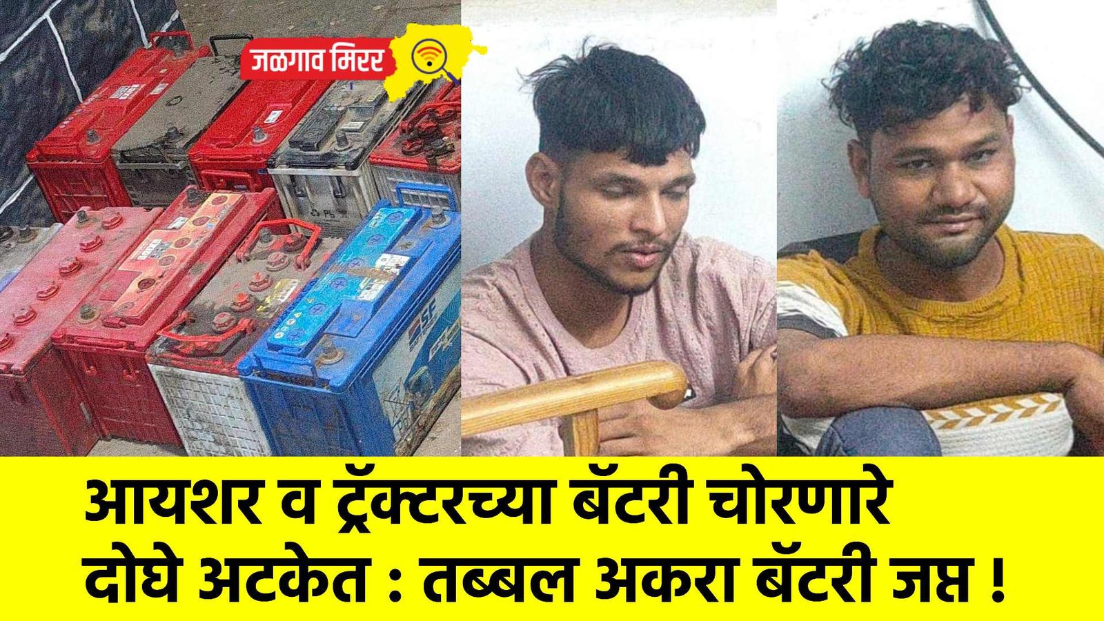 सविस्तर वृत्त असे कि, शहरातील चाळीसगाव रोड लगत असलेल्या ग्रीन पार्क कॉलनी येथे आयशर गाडी व ट्रॅक्टर हे दि २१ रोजी रात्री लावलेले होते. यावेळी मध्यरात्री कॉलनीतील दोन चोरटयांनी लबाडीच्या इराद्याने आयशर गाडी व ट्रॅक्टर नऊ गाड्यांमधील मधील वेगवेगळ्या एक्साईड कंपनीची अकरा बॅटरी एकूण ५३,००० रुपये किमतीच्या चोरुन नेल्या आहेत. यावेळी पोलीस स्टेशनचे पो.कॉ. प्रवीण परदेशी व अमजद पठाण यांनी सदर तपास चक्र फिरवत दोन तासातच आरोपींना तात्काळ जेरबंद बंद केले.