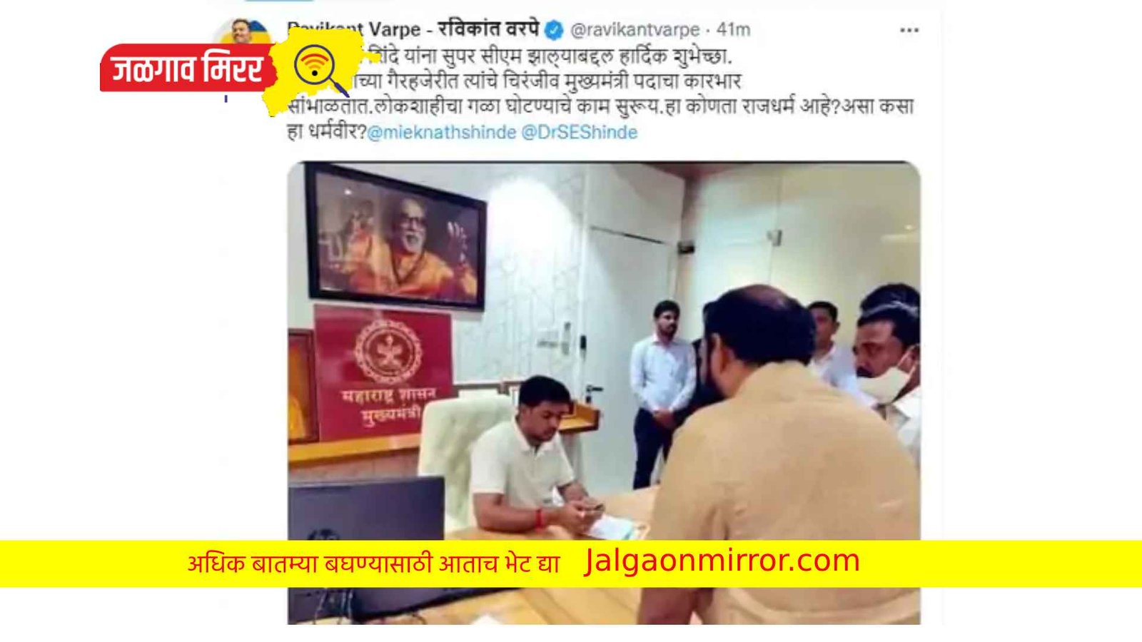 मुख्यमंत्री एकनाथ शिंदे यांच्या गैरहजेरीत त्यांचे सुपुत्र खासदार श्रीकांत शिंदे हेच मुख्यमंत्र्यांच्या खुर्चीवर बसल्याचे छायात्रित्र व्हायरल झाल्याने मोठा वाद निर्माण झाला आहे. राष्ट्रवादी युवक काँग्रेसचे कार्याध्यक्ष रविकांत वरपे यांनी ट्विटवर हा फोटो अपलोड केला आहे. त्यात मुख्यमंत्र्यांच्या खुर्चीवर एकनाथ शिंदे बसलेले दिसत आहेत. मात्र, मुख्यमंत्री शिंदे गटाचे प्रवक्ते नरेश म्हस्के यांनी हा आरोप फेटाळला आहे.