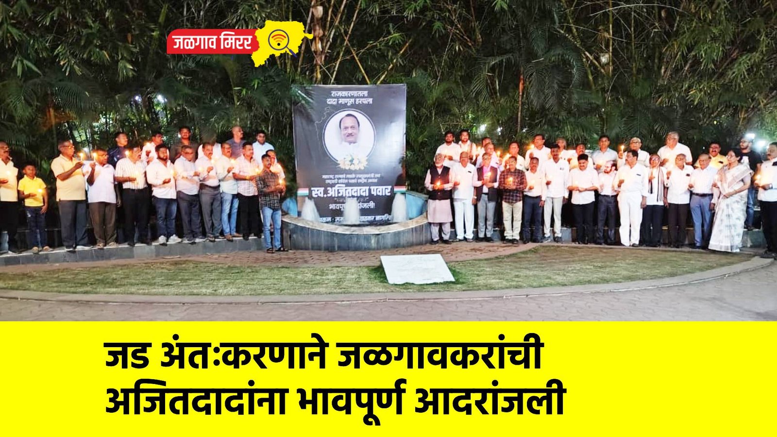 महाराष्ट्र राज्याचे उपमुख्यमंत्री स्व. अजितदादा पवार यांना जळगावकर नागरिकांनी जड अंतःकरणाने भावपूर्ण आदरांजली वाहिली. शुक्रवार दि. ३० जानेवारी २०२६ रोजी सायंकाळी ६.३० वाजता काव्यरत्नावली चौक, जळगाव येथे समस्त जळगावकर नागरिकांतर्फे पुष्प अर्पण, मेणबत्त्या प्रज्वलित करून तसेच तीन मिनिटांचे मौन पाळत स्व. अजितदादांना श्रद्धांजली अर्पण करण्यात आली.