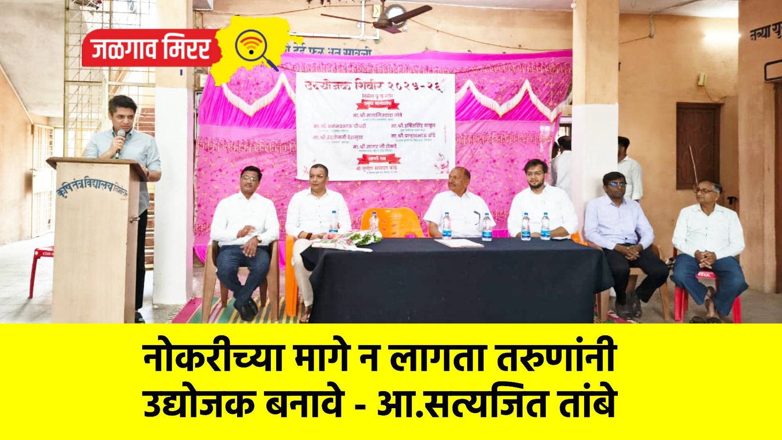 येथे दि.३१ जानेवारी रोजी कृषीतंत्र विद्यालयात निंभोरा व पंचक्रोशीतील छोटे व्यापारी तसेच मध्यम व मोठ्या व्यावसायिकांसाठी उद्योजक शिबिर सामाजिक कार्यकर्ते सुनिल कोंडे यांनी आयोजित केले होते.यावेळी कार्यक्रमासाठी प्रमुख पाहुणे म्हणून पदवीधर मतदार संघाचे आमदार सत्यजित तांबे हे उपस्थित होते. यावेळी त्यांनी आपल्या मनोगतातून तरुणांनी फक्त नोकरीच्या मागे न लागता व्यवसायातून उद्योजक व्हावे व आपल्या परिसरात समृद्धी आणण्याचे आवाहन या उद्योजक मेळाव्यात बोलताना केले.